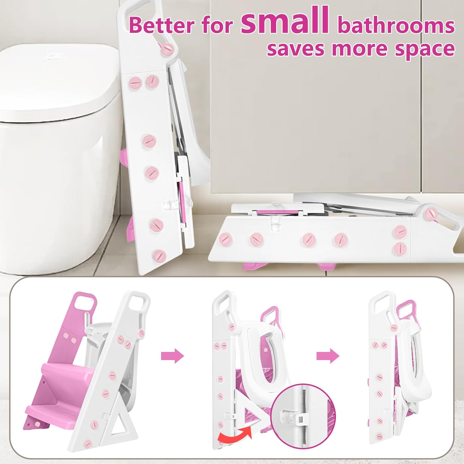 Easy Storage Potty Training Seat with Ladder, Adjustable Step and Toilet Seat Height, Easy-Grip Handles for Climbing, Foldable Portable Toddler Toilet Trainer, Perfect for Small Bathrooms