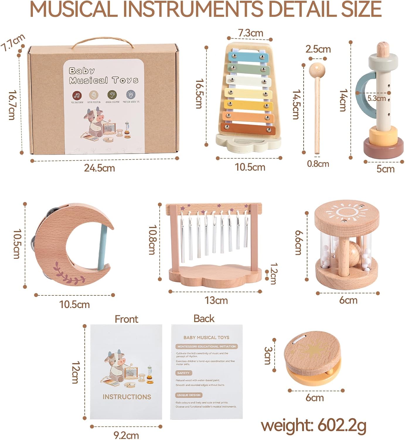 - Comprehensive Toddler Musical Instruments Set--This Montessori Wooden Toys set features an array of instruments including a xylophone with sticks , a tambourine, a castanet, a clarinet and a unique wooden wind chime, allowing your little musician to explore various tones, volumes, and rhythms for a delightful musical experience