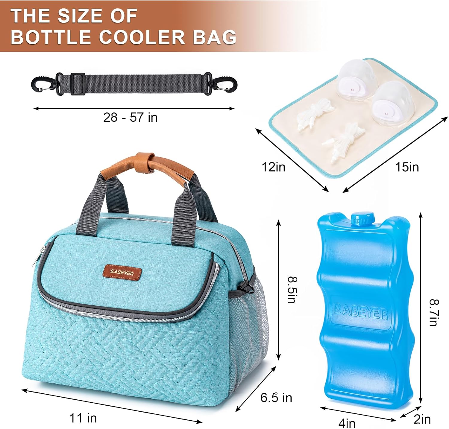 - Easy to Carry: BABEYER breastmilk cooler bag come with an adjustable shoulder strap which can be cross-body over the shoulder. Comfortable leather handle for easy put on the stroller. Come with a PEVA waterproof mat, it can be used to place baby bottles, breast pumps & accessories
