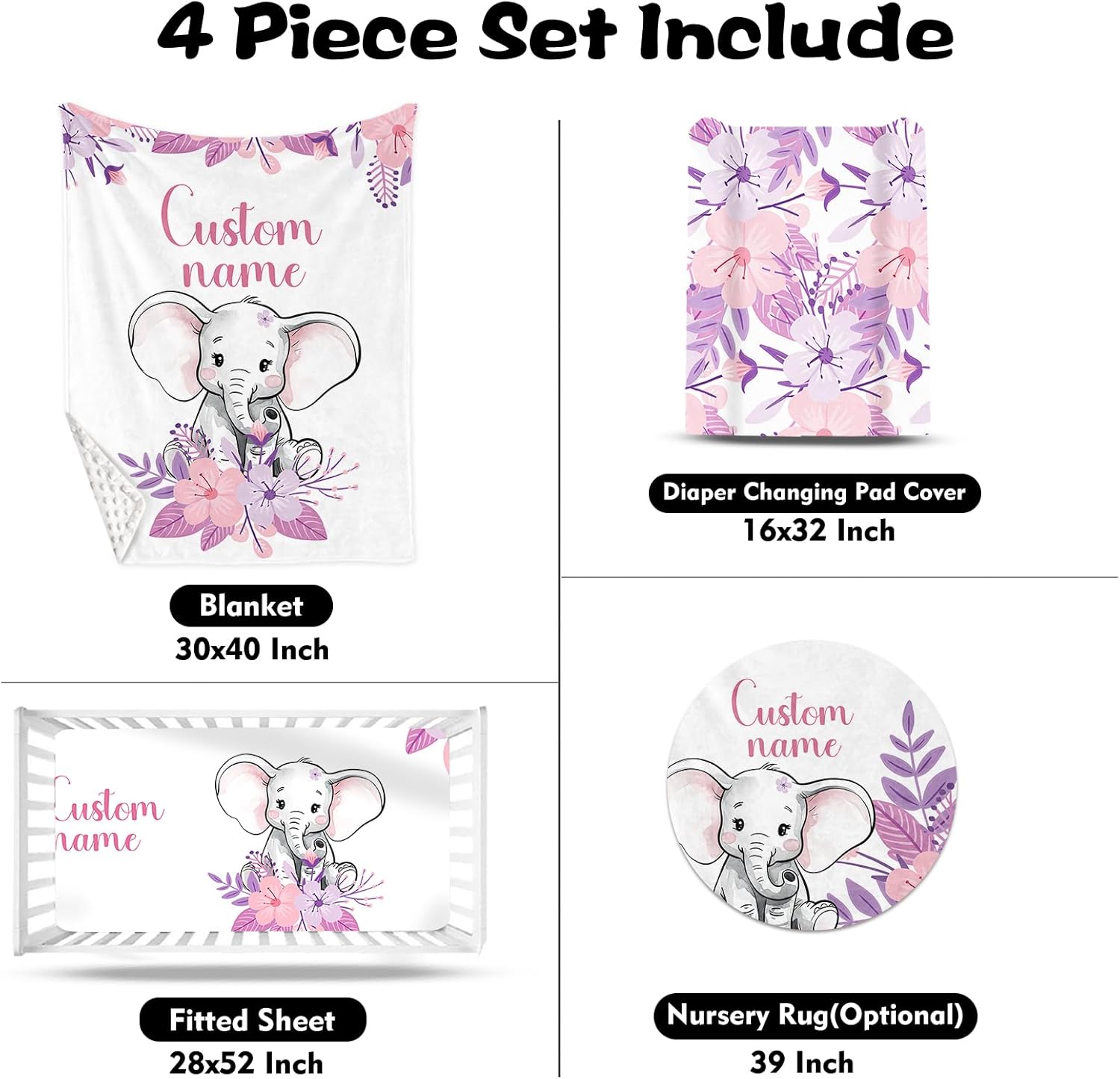Custom Nursery Crib Bedding Set: Personalized Name 4 Piece Purple Flower Elephant Design Baby Crib Sets for Girls - Toddler Double Layer Blanket Set, Comfortable Crib Bed Sheets for Baby Toddlers