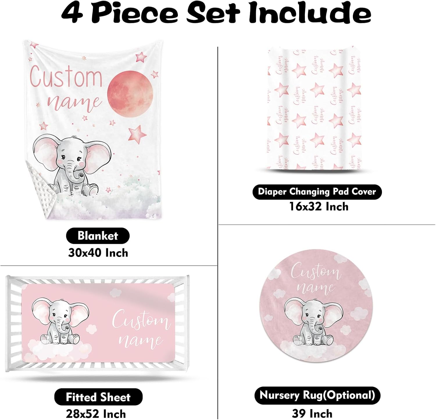 Custom Nursery Crib Bedding Set: Personalized Name 4 Piece Starry Sky Elephant Design Baby Crib Sets for Girls - Toddler Double Layer Blanket Set, Comfortable Crib Bed Sheets for Baby Toddlers