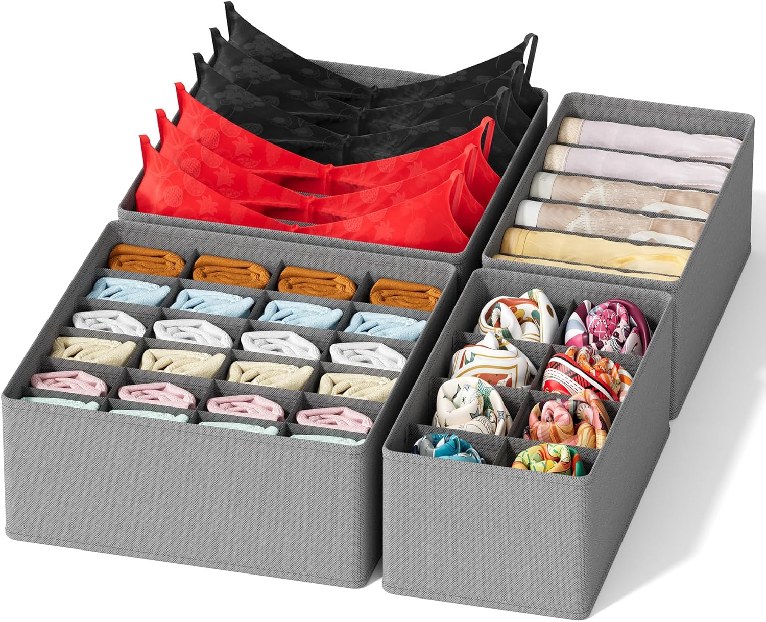 SpaceAid Underwear Drawer Organizer, 4 Pack Dresser Organizer Bins for Nursery, Closet Organization and Storage with Dividers for Baby Clothes Socks Bra Ties Scarf (Grey)