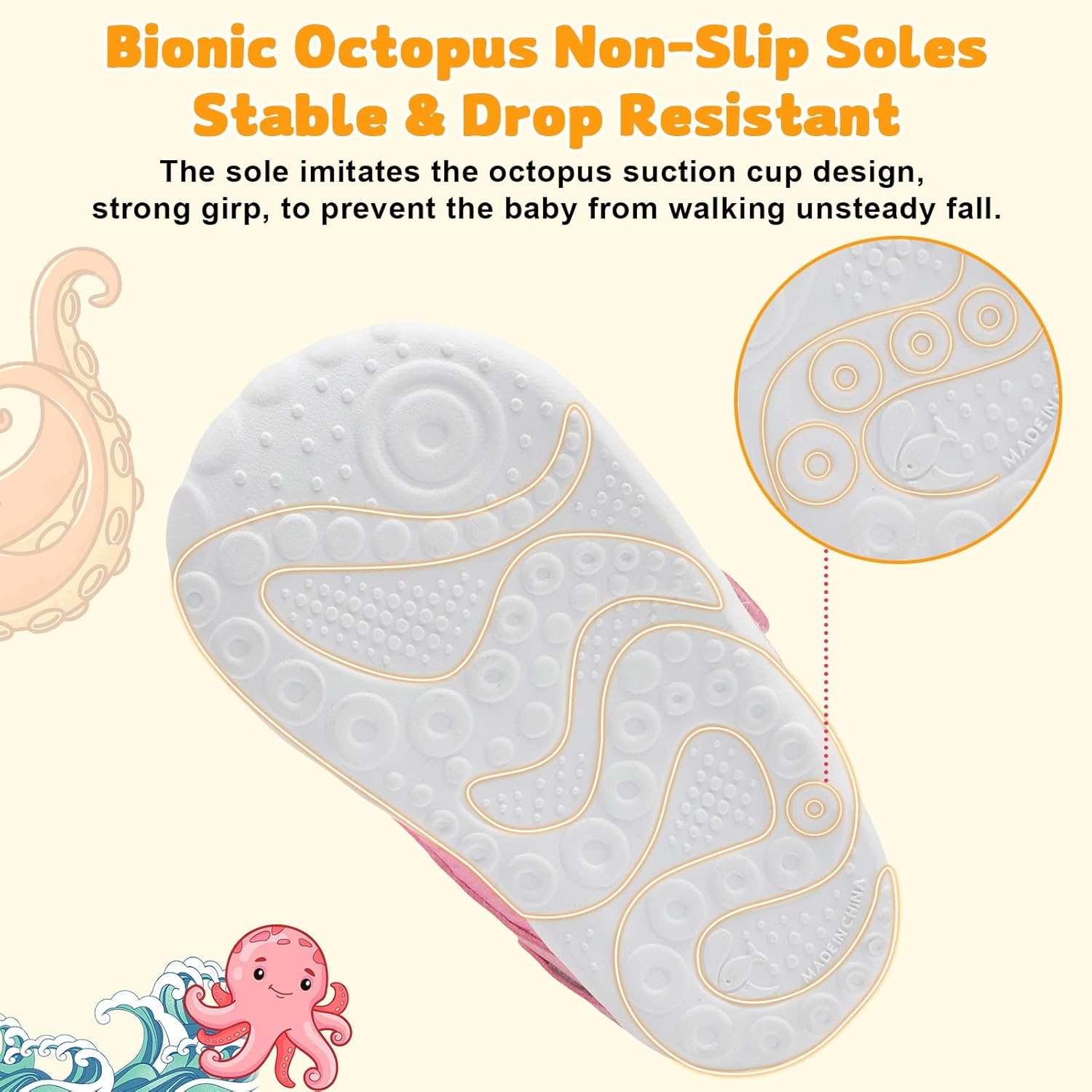 - TPR NON-SLIP SOLE: The sole imitates the octopus design, has been subjected to 2W+ friction tests, strong girp, to prevent the baby from walking unsteady fall