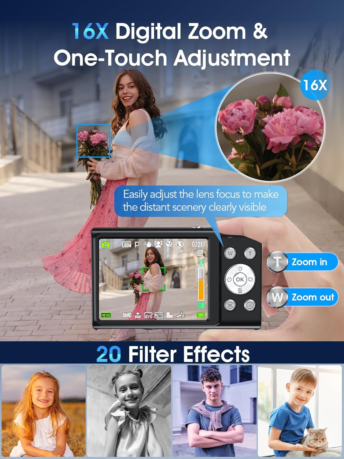 - 【16X Digital Zoom & Versatile Shooting Modes】 Want to capture distant landscapes or zoom in on wildlife? With 16X digital zoom, this camera allows you to bring distant subjects into focus with ease. The built-in image stabilization ensures your photos are steady and sharp. Features like smile capture, continuous shooting, and self-timer make it the perfect choice for documenting family gatherings, friend parties, and other joyful moments.