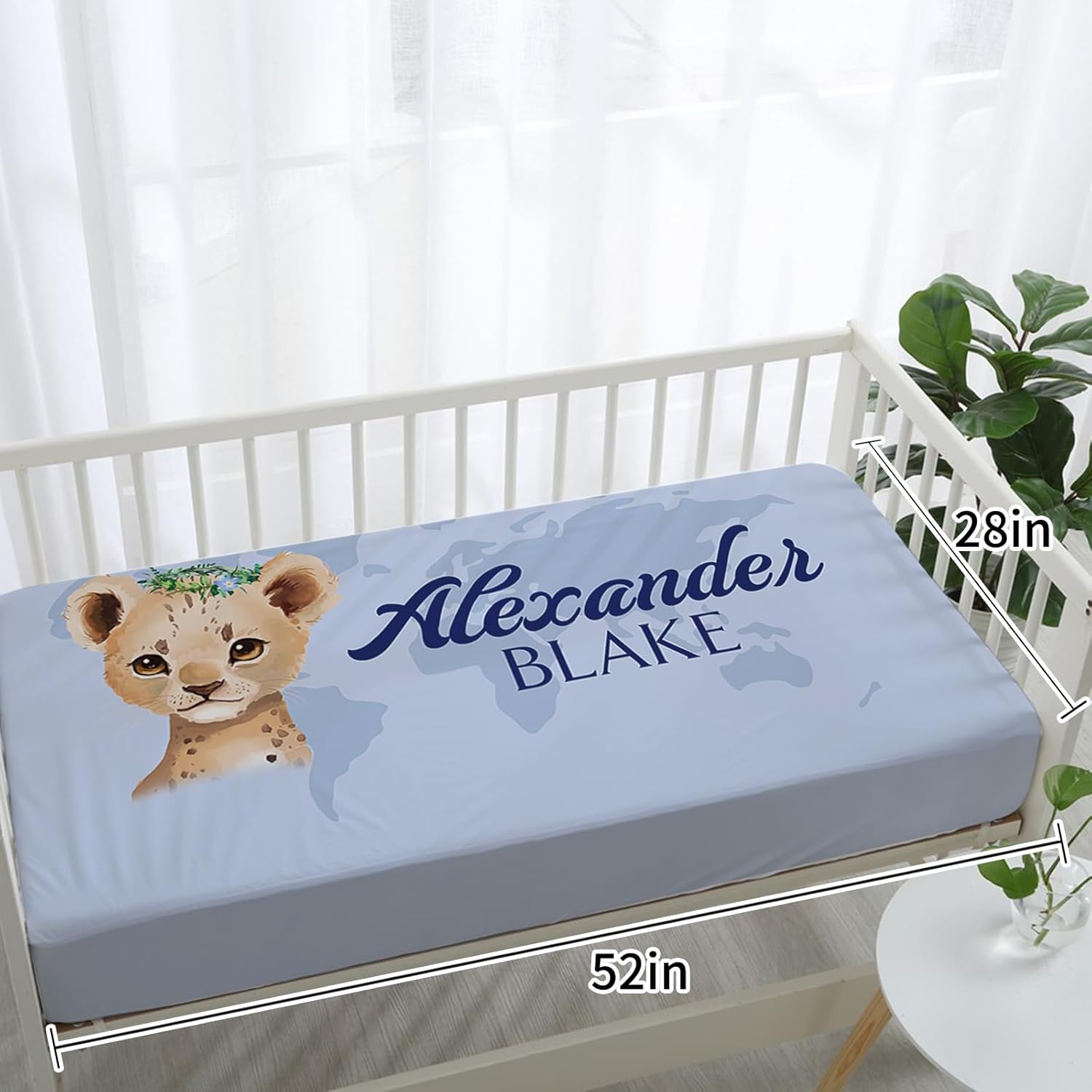 Personalized Baby Crib Bedding Set for Baby Boys Girls, Blue Leopard Pattern Custom Name Baby Crib Sets 5-Pcs, Toddler Double Layer Blanket Fitted Sheets Changing Pad Cover Rug Wall Art Set