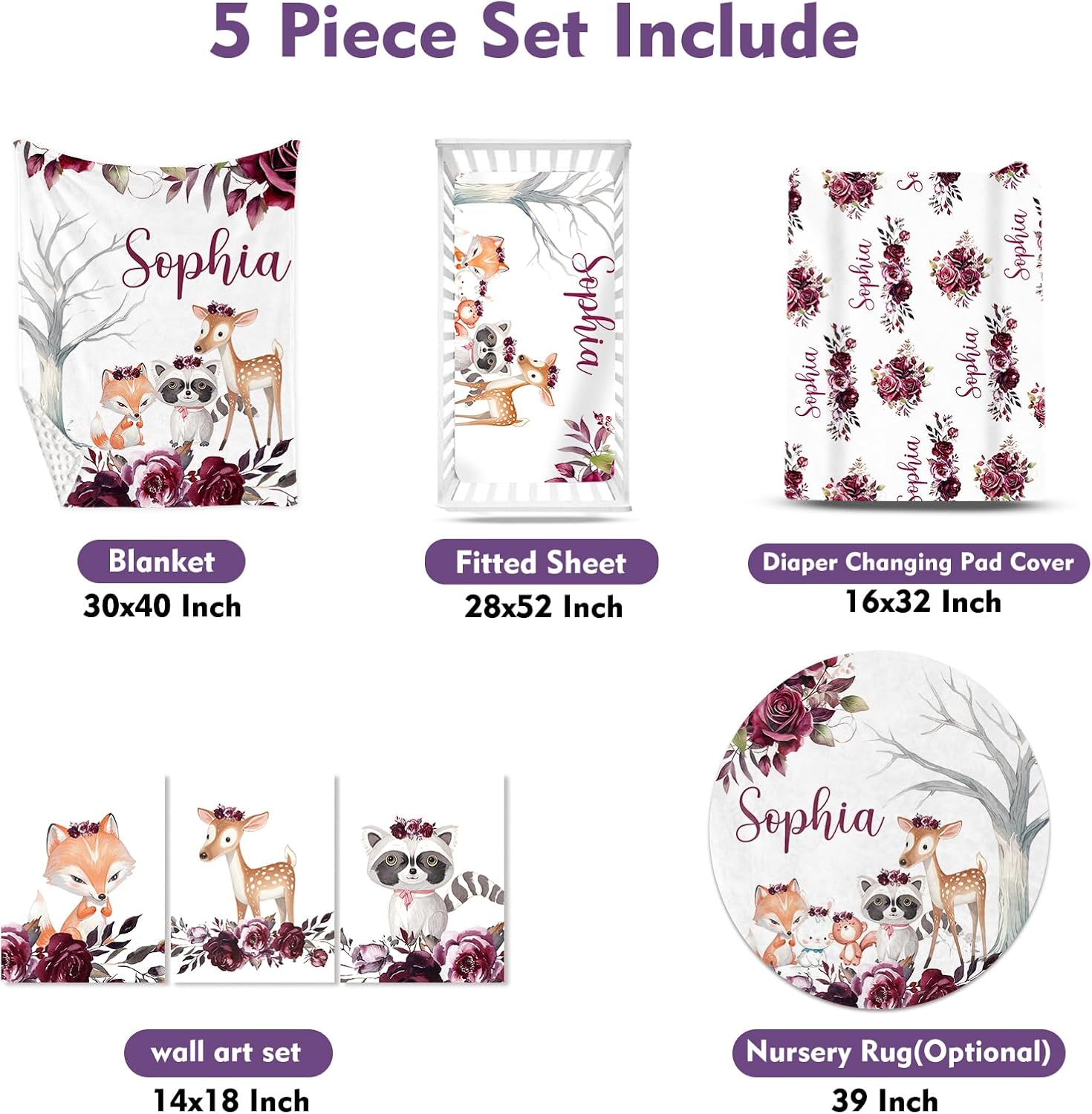 - Complete Nursery Set: Transform your baby's nursery into a dreamy and enchanting space with our 5-piece baby crib set. It includes a baby blanket, crib fitted sheet, baby rug, diaper changing pad cover and a set of coordinating wall art to coordinate your nursery dรฉcor effortlessly.