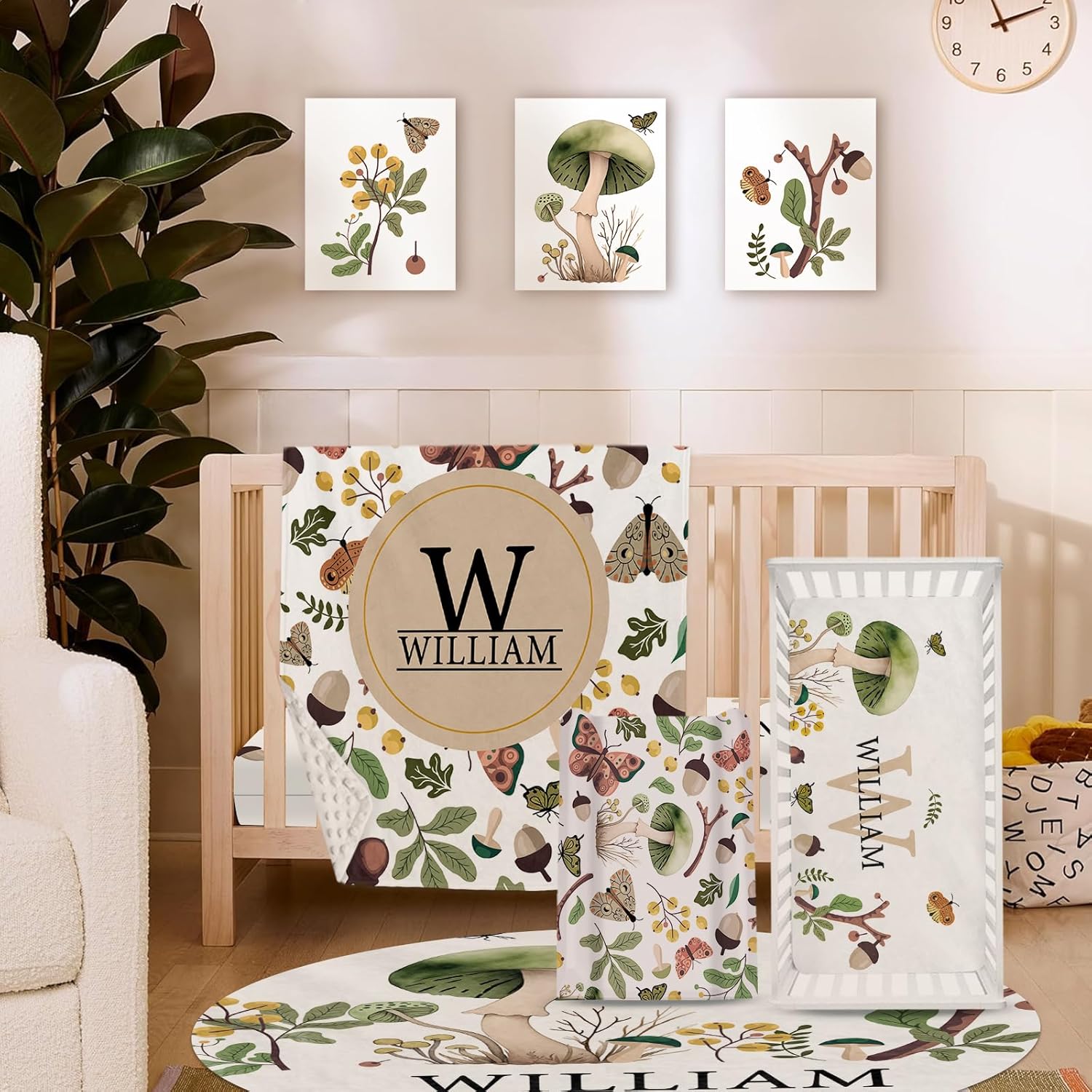Personalized Baby Crib Bedding Set for Baby Boys Girls, Mushroom Design Custom Name Baby Crib Sets 5-Pcs, Toddler Double Layer Blanket Fitted Sheets Changing Pad Cover Rug Wall Art Set