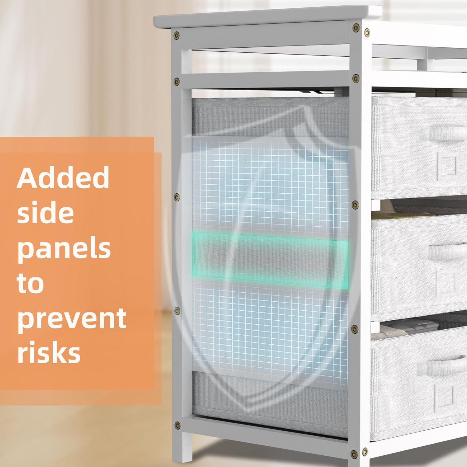 - Safe Design: The baby changing table is made of multi-layer wood, MDF, fabric, non-woven, polyurethane foam and PEVA vinyl, which is odorless, safe and stable. Added side panel, safety belt, comfy foam changing pad and reinforced safety rails around the top create a more safe using environment. The robust construction meets all safety standards, providing a secure and stable surface for all diaper changes.