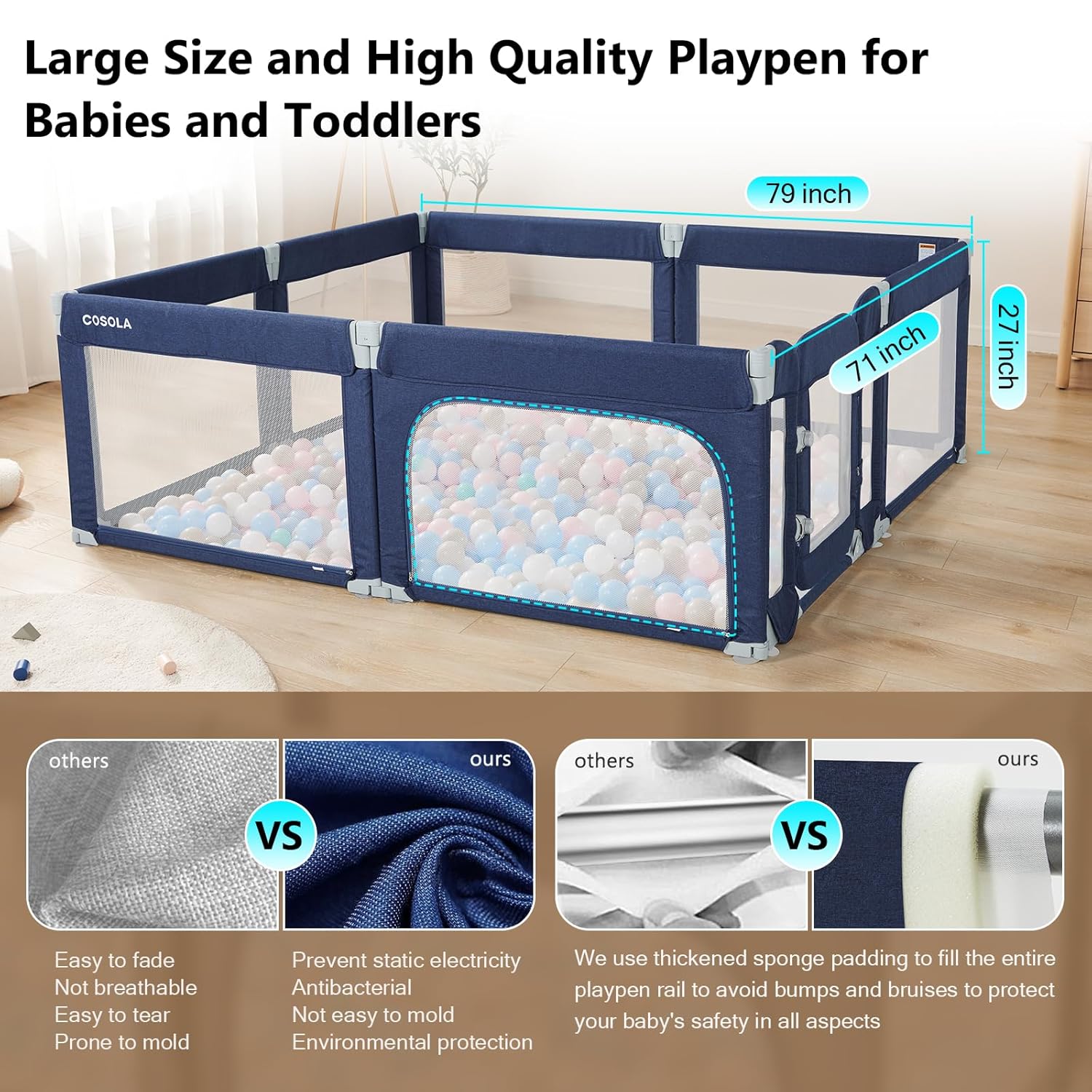 - [Extra Large Space]: With dimensions of 79 x 71 inches,the baby playpen provides spacious space for both parents and toddlers, ensuring a safe and fun environment for your baby to explore whether indoors or outdoors.