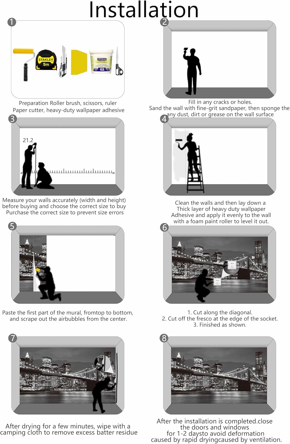 - Installation Steps1. Fill in any cracks or holes and clean the surface of the wall of dust, dirt and grease.2. Apply heavy-duty wallpaper paste to the wall, not the mural.3. Mark the position of each strip of wallpaper with a spirit level.4. Align the pattern and slide it into place.5. Scrape the bubbles with a spatula.6. Let it dry for a couple of minutes and it's ready to go!