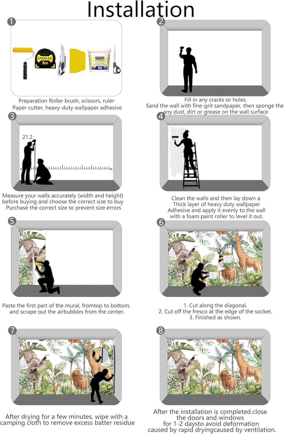 - Installation Steps1. Fill in any cracks or holes and clean the surface of the wall of dust, dirt and grease.2. Apply heavy-duty wallpaper paste to the wall, not the mural.3. Mark the position of each strip of wallpaper with a spirit level.4. Align the pattern and slide it into place.5. Scrape the bubbles with a spatula.6. Let it dry for a couple of minutes and it's ready to go!