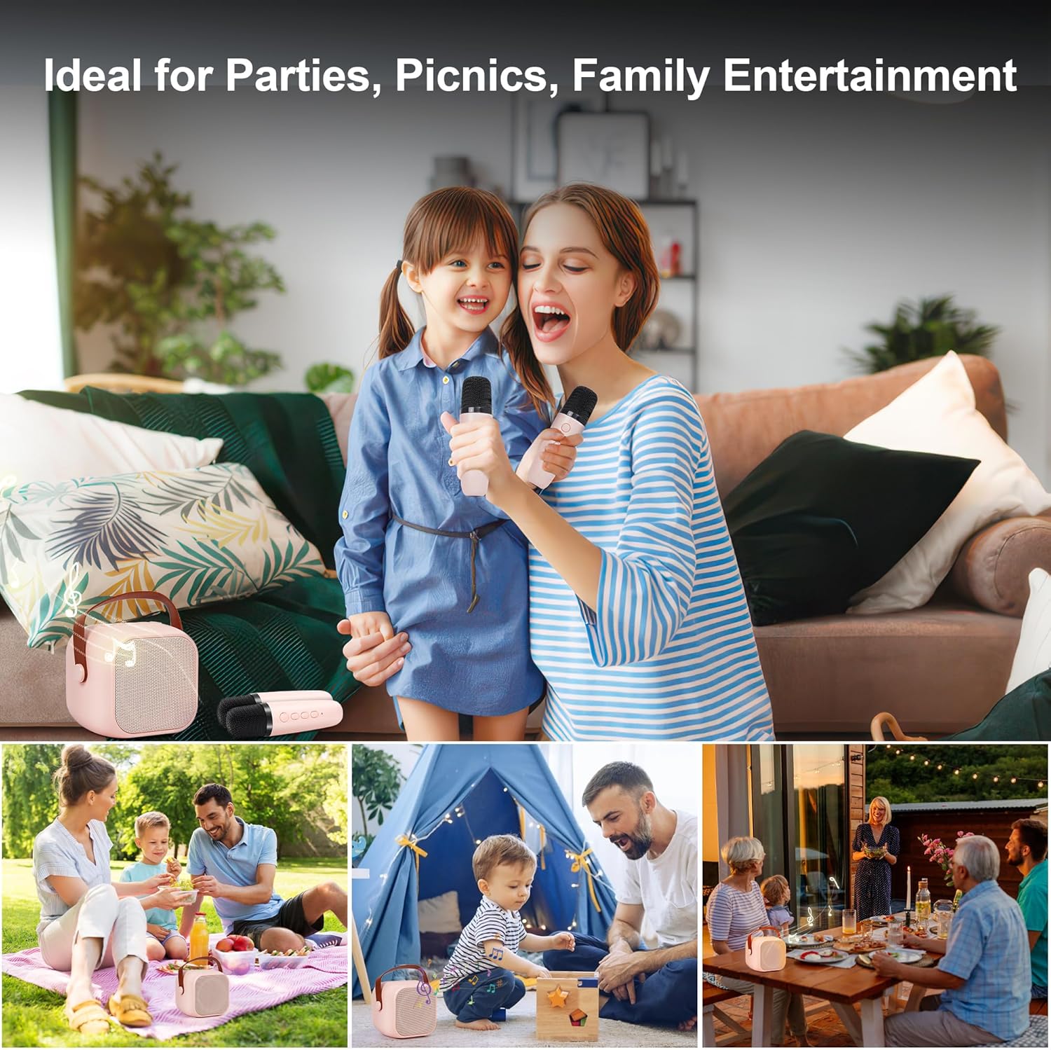 Portable Karaoke Machine with Bluetooth, Party Lights, 2 Wireless Microphones for Adults Kids Karaoke Speaker Birthday Gifts for Girls Boys Family Home Party (Pink 2 Mics)