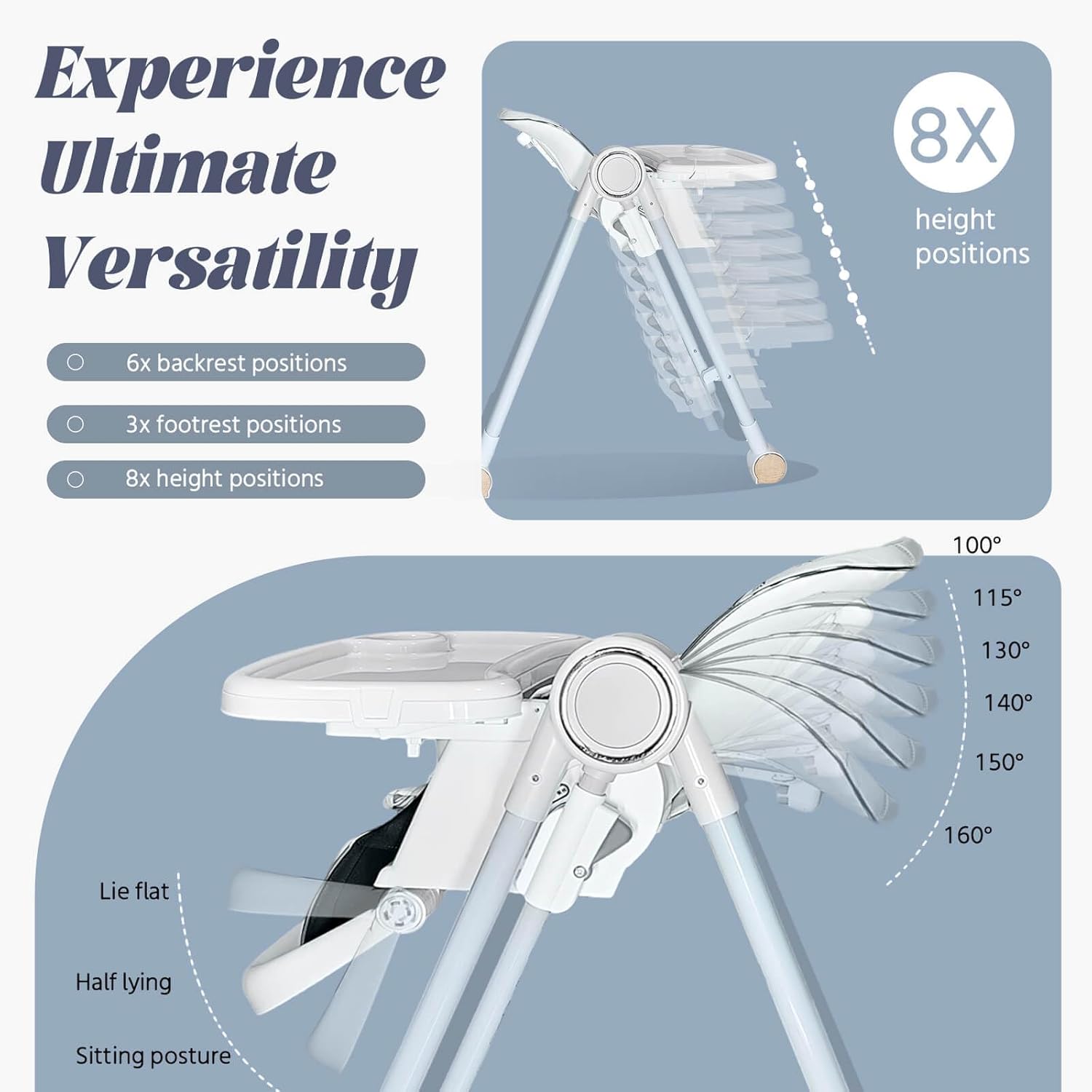 - 4.Flexible Adjustments: Features 8-level height adjustment, 4-level backrest recline, and a 5-position extendable tray to grow with your child.