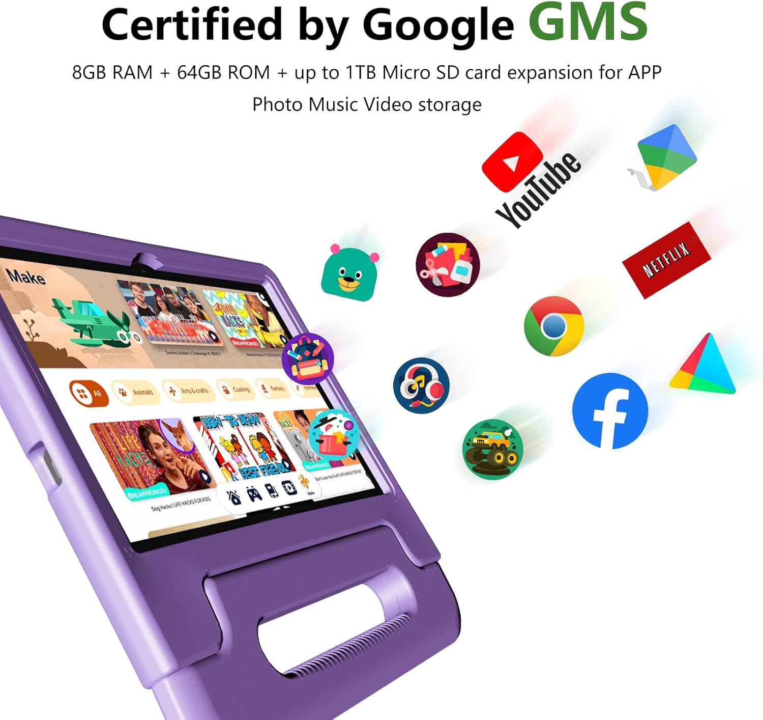 Kids Tablet 8GB+64GB, 10 Inch Android 14 Tablet for Kids 6000mAh with Case, WiFi 6, Bth 5.2, Dual Camera, GPS Pre-Installed Parental Controls, Kids Space & Family Link Great Gift for Toddler Children
