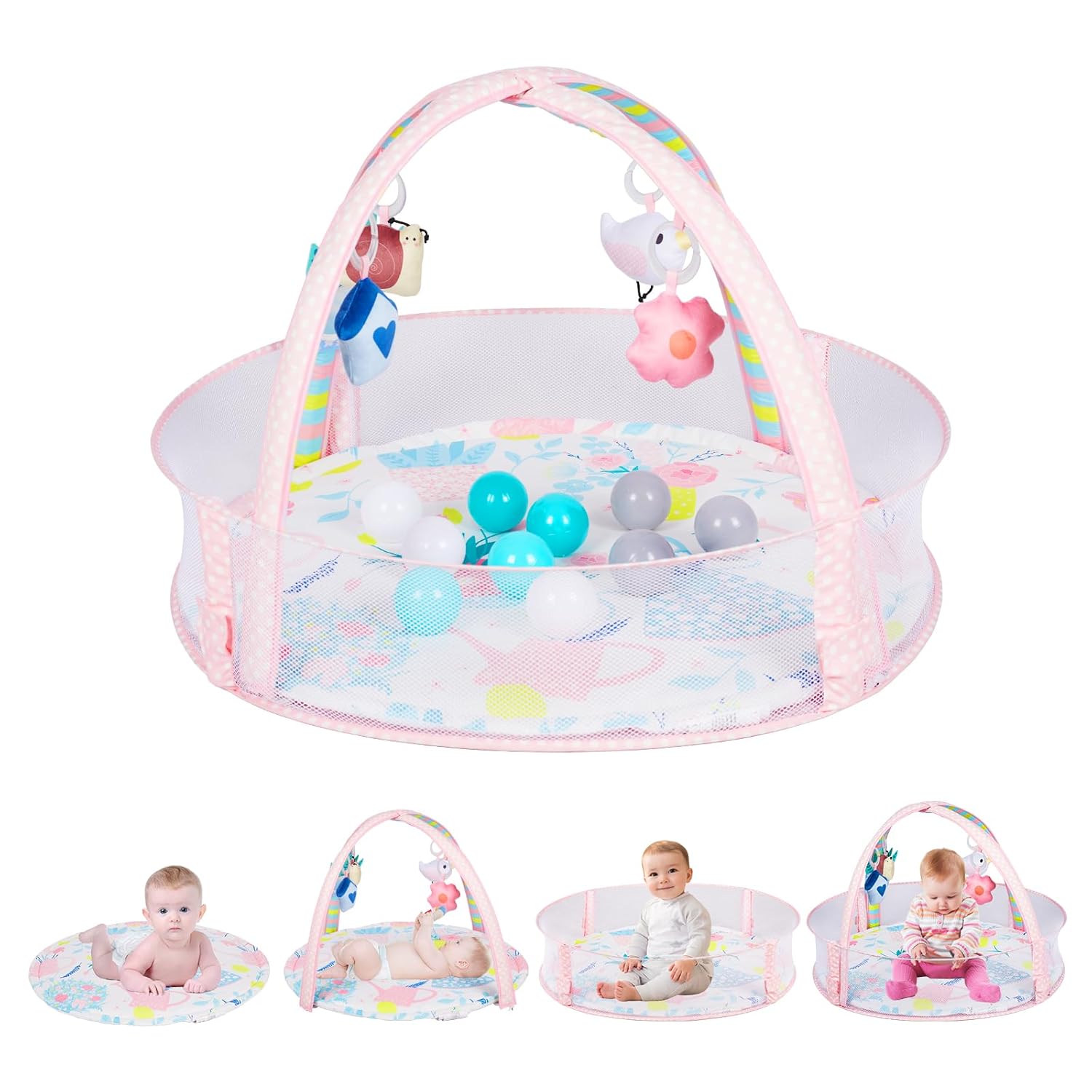 - [Multi-Mode Baby Play Mat Activity Gym]: Featuring fun patterns and colors, our baby activity mat is designed to attract and entertain. Supports tummy time, seated play, and ball games, aiding exploration and sensory growth. (Includes ocean balls, fabric toys, and mirror)