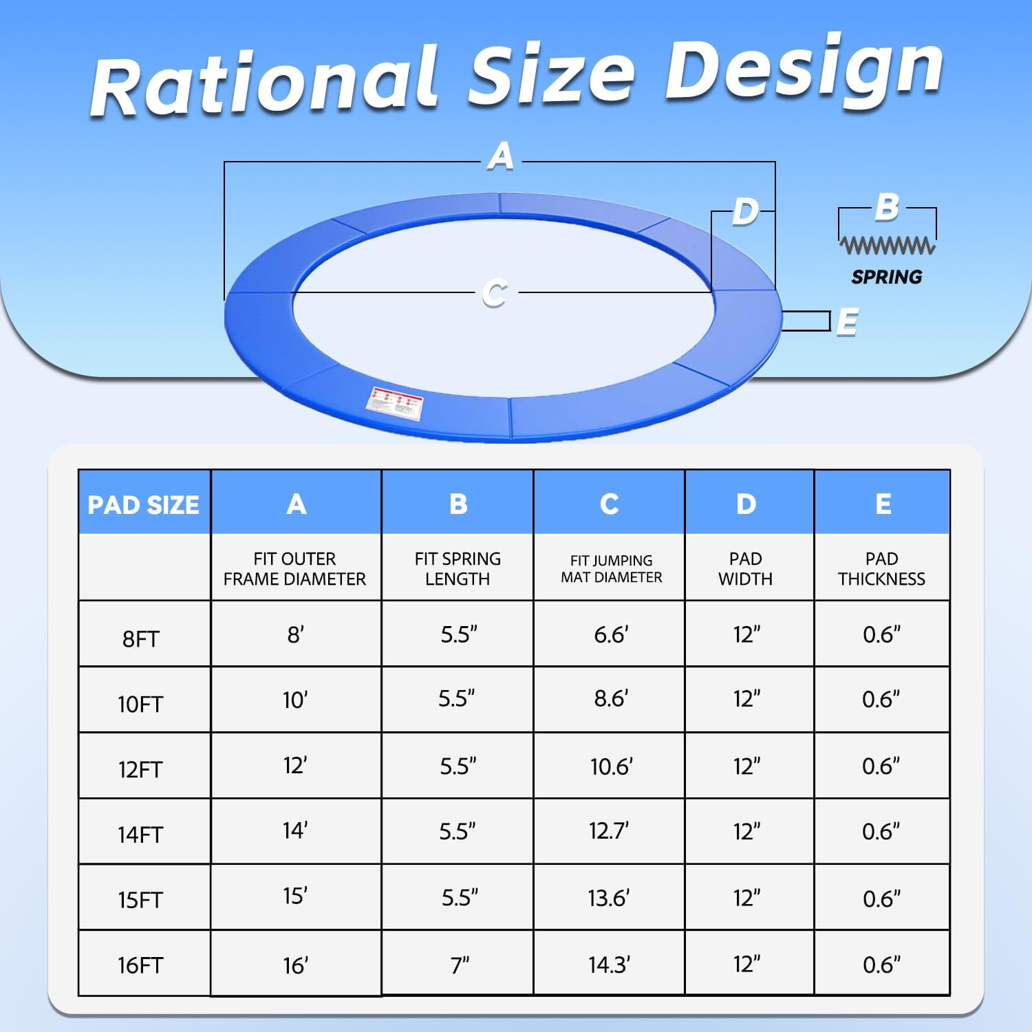 - Universal Size: KENSONE trampoline replacement pad is made for universal use, fitted with most 8/10/12/14/15/16FT trampoline frame in the market. The pad is not stretchable, please carefully measure the size of your trampoline frame before purchasing to avoid size mismatch. We have presented detailed product size data in the product pictures for your reference