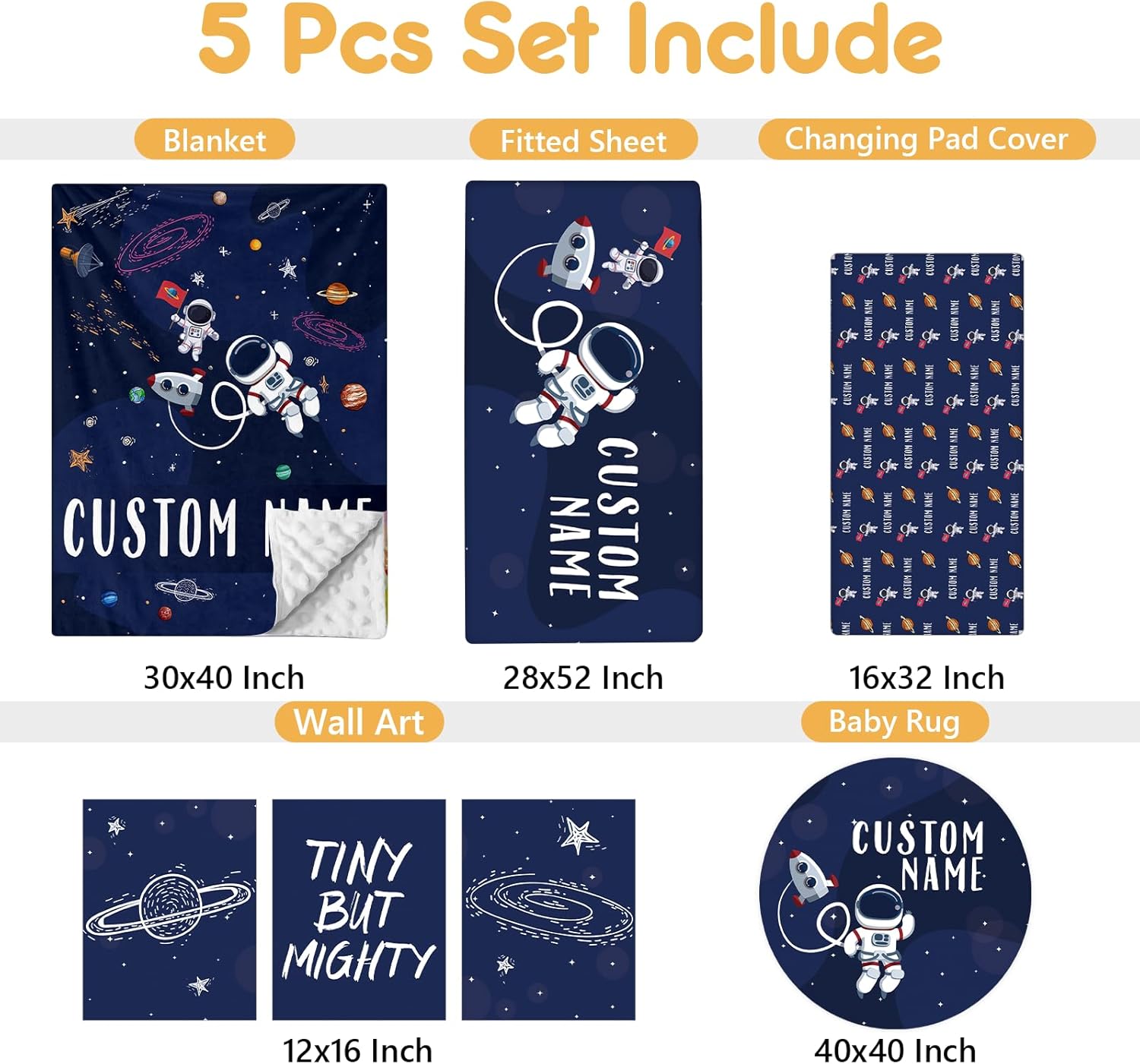 - Complete Set: This customized baby bedding set includes a double layer dotted backing blanket, crib sheet, changing pad cover, baby rug and wall arts, designed to add style and comfort to your nursery. The dotted backing of the double-layer blanket will be adored by your little one.
