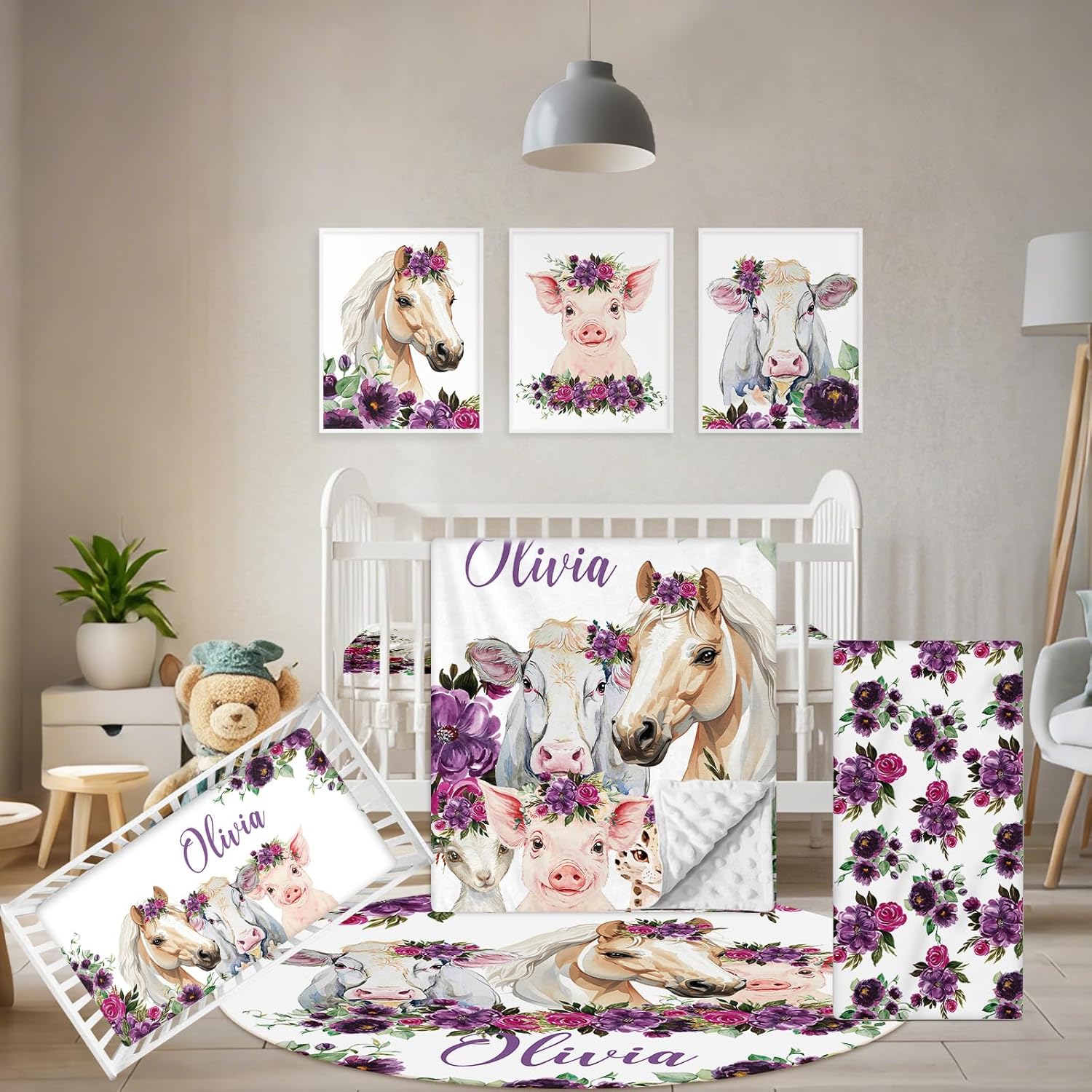 - Complete Set: This customized baby bedding set includes a double layer dotted backing blanket, crib sheet, changing pad cover, baby rug and wall arts, designed to add style and comfort to your nursery. The dotted backing of the double-layer blanket will be adored by your little one.