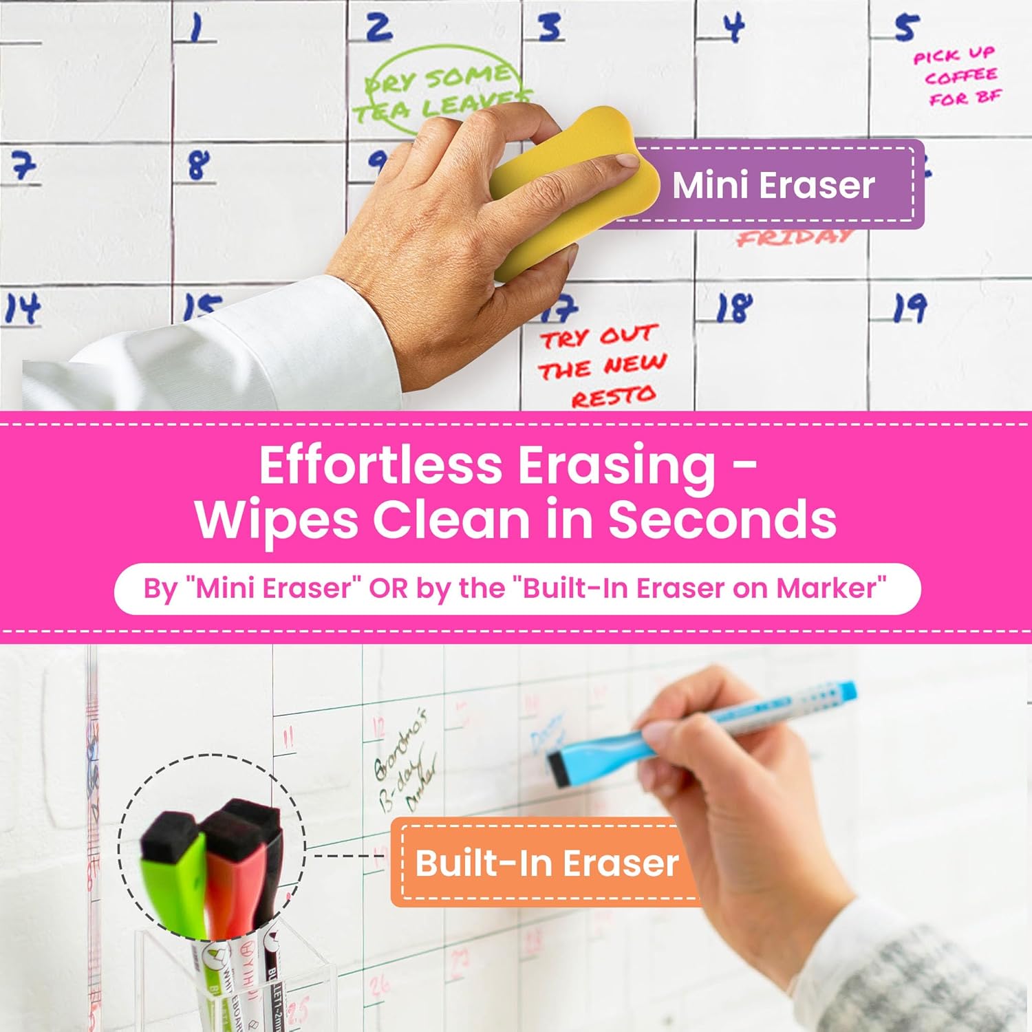 - Magnetic Pen & Tray Holders Included - Keep your writing tools within reach! This dry-erase clear wall calendar comes with magnetic pen and eraser holders that easily attach to the surface, ensuring nothing gets misplaced.