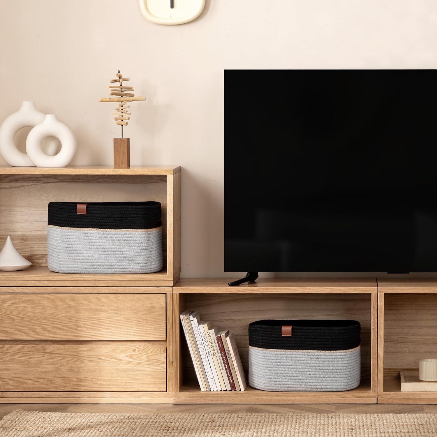 UBBCARE 4 Pack Baskets for Organizing, Woven Storage Baskets with Label for Toys and Towel, Rectangle Cotton Rope Basket with Handles, 15''L x10''W x9''H, Black&Grey