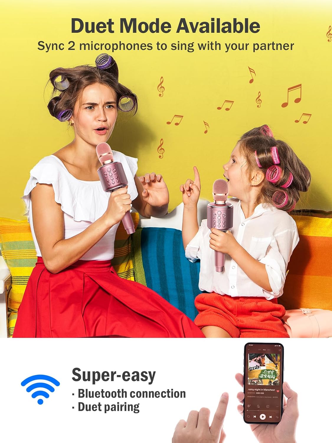 - ăDuet Mode for Singing TogetherăThe karaoke microphone can synchronize with another one, enabling two people singing together. You can sing alone, or sing with your kids and friends, enjoying the happiness together.
