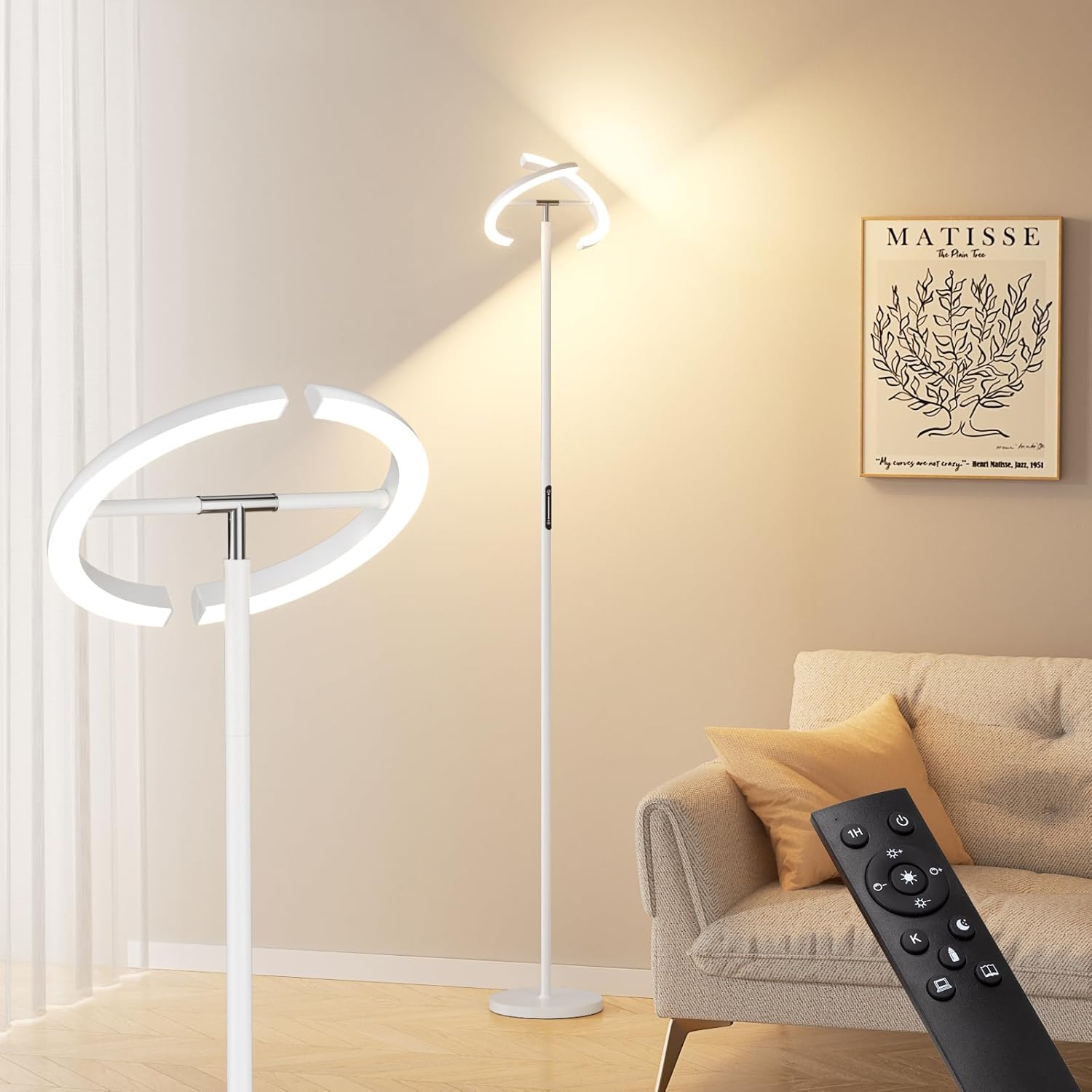 - 【Adjustable Brightness & Color Temperature】- Torchiere floor lamps for bedroom come with stepless dimming from 10% to 100%, ensuring that you can easily set up a perfectly bright environment for any occasion. Easily switch and adjust between warm white (3000K) to cool daylight (6000K) to transition from a cozy to an energizing atmosphere. With four preset modes (Working, Reading, Relaxing, Night), simply tap a button of remote to light up your room and illuminate your life.