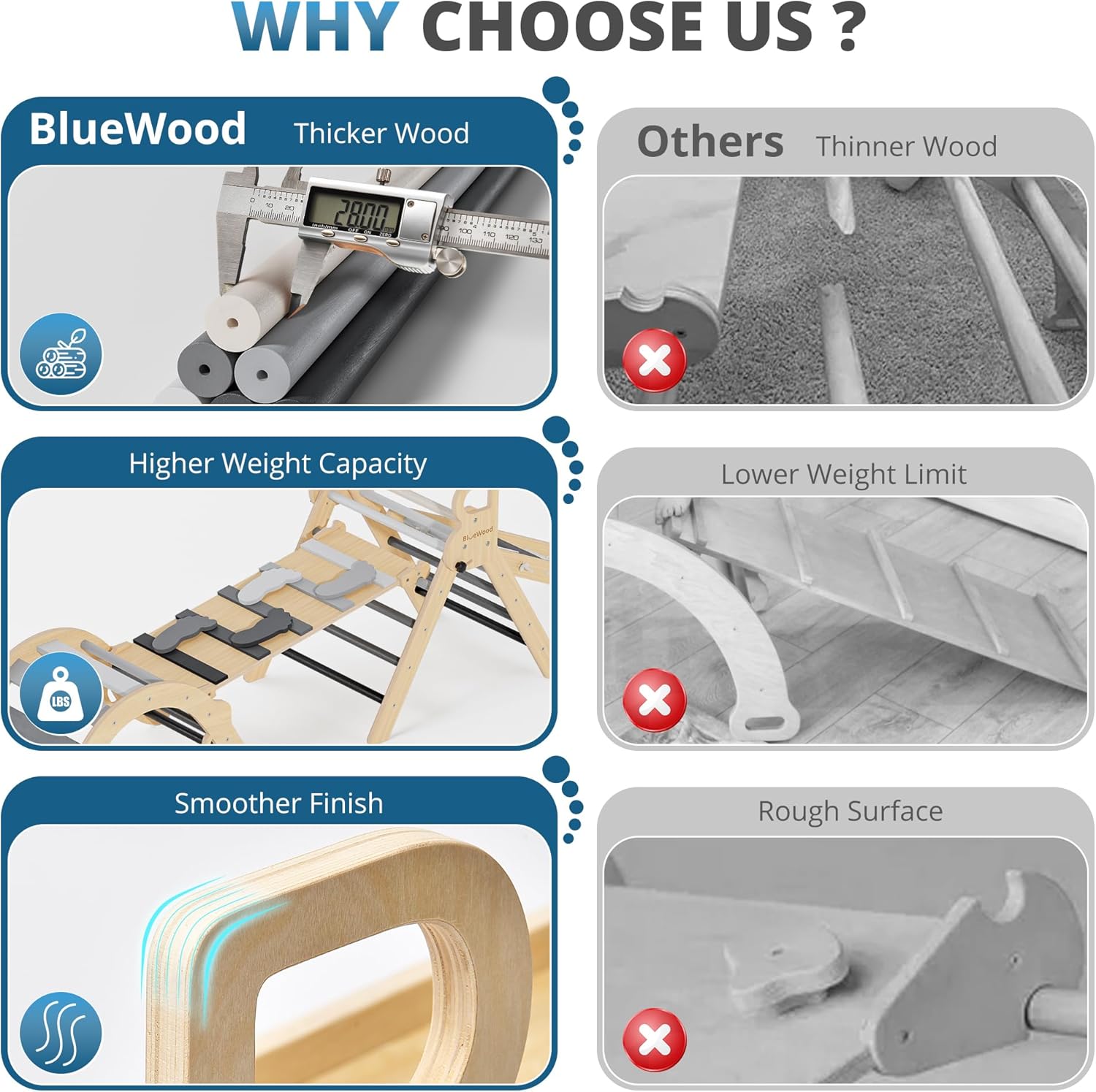 BlueWood 10-in-1 Pikler Triangle Set, Toddler Climbing Toys Indoor, Montessori Climber, Baby Jungle Gyms with Arch, Extra Rope Ladder & Footprint Balance Beam - Grey Twilight