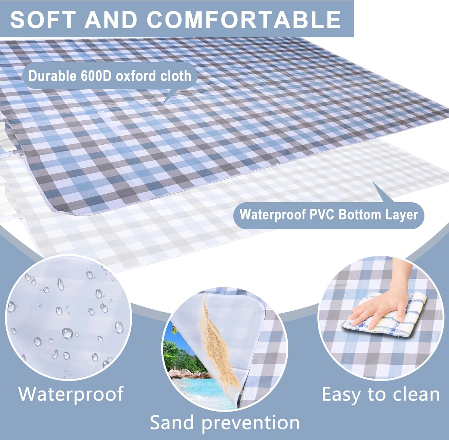80"x60" Waterproof Sandproof Picnic Mat - Portable Foldable Outdoor Blanket for Beach, Park, Travel & Indoor Use - Lightweight Compact Design, Easy-Carry (Blue&Gray)