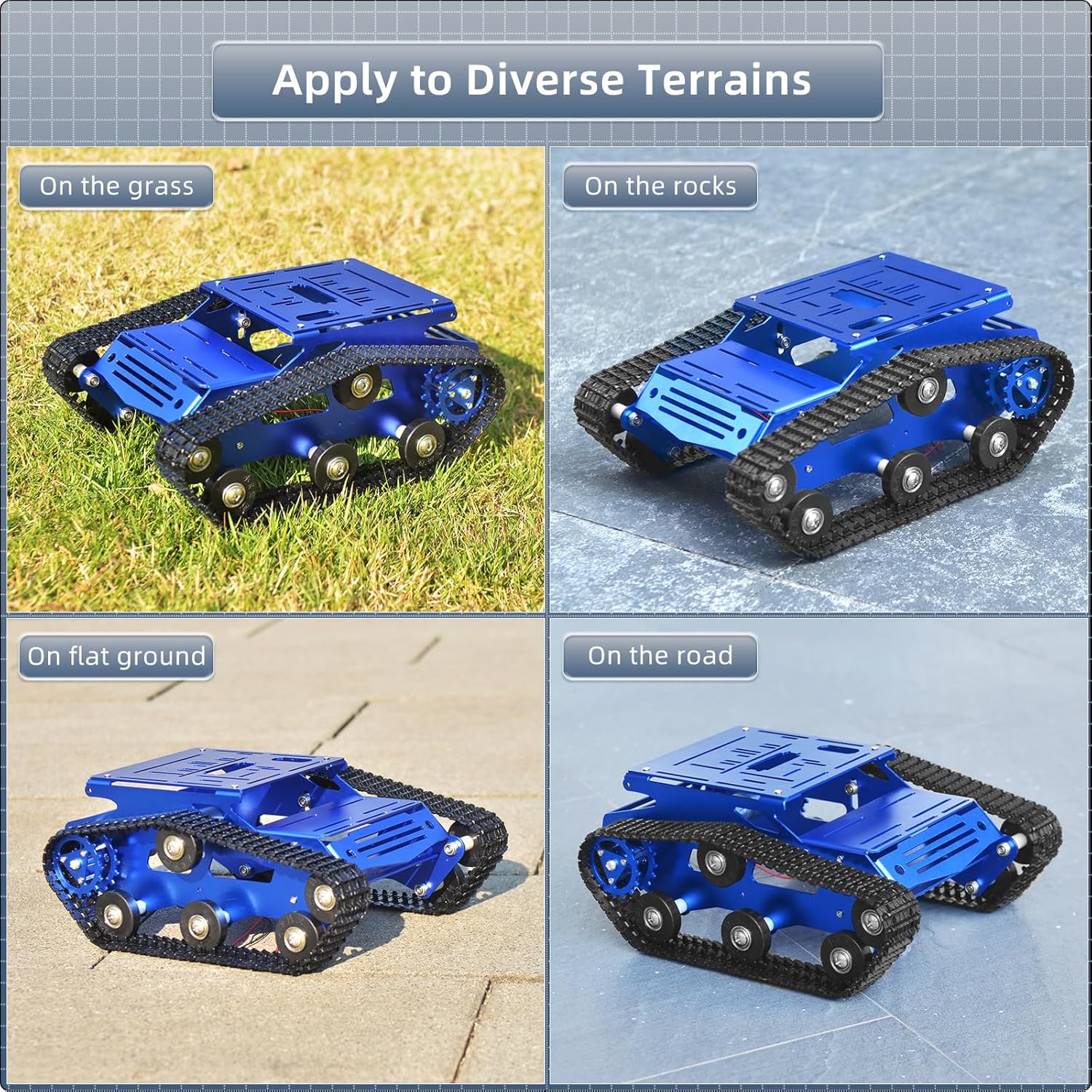 - 【High strength robot tank base】This is an agile tracked chassis, low noise and easy to control, which is a good partner for you to learning robotics.The robot chassis uses high strength aluminum alloy which makes it extremely solid and durable. The top bracket can be disassembled at will, so that you can achieve more expansion.