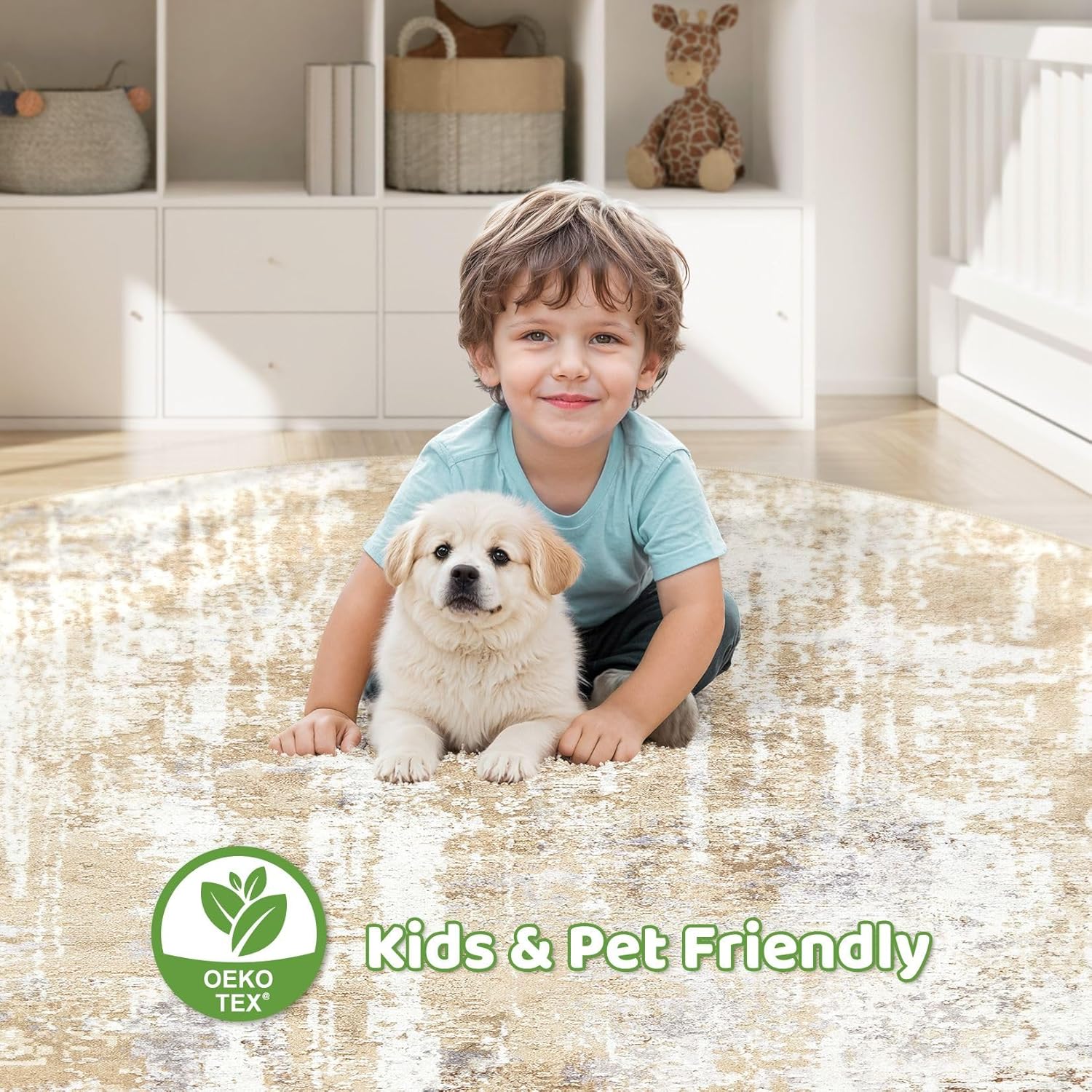 Round Rug Living Room Rugs: 8Ft Washable Circle Large Abstract Modern Soft Stain Resistant Non Slip Indoor Floor Carpet for Bedroom Nursery Office Dining Room Dorm Home House Decor- Gray Gold