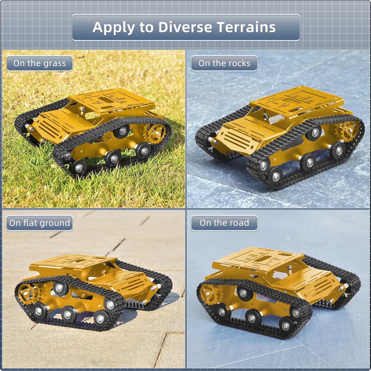 - 【High strength robot tank base】This is an agile tracked chassis, low noise and easy to control, which is a good partner for you to learning robotics.The robot chassis uses high strength aluminum alloy which makes it extremely solid and durable. The top bracket can be disassembled at will, so that you can achieve more expansion.