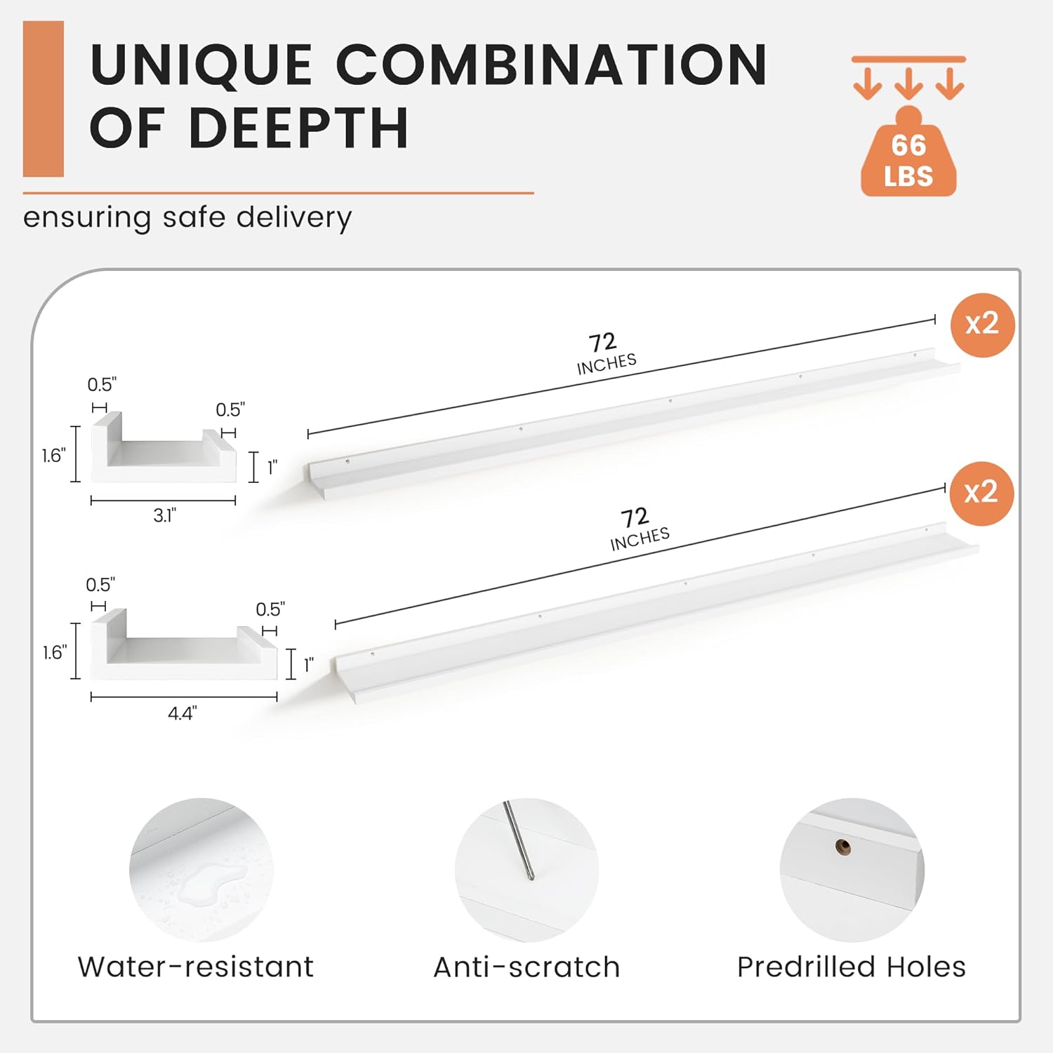 Floating Picture Ledge Shelves for Wall Set of 4, 72 Inch Wall Shelves with Lip Long Large Nursery Book Shelf for Toys Storage Kids Bookshelf Wall Mounted Living Room Bedroom Decor Frames
