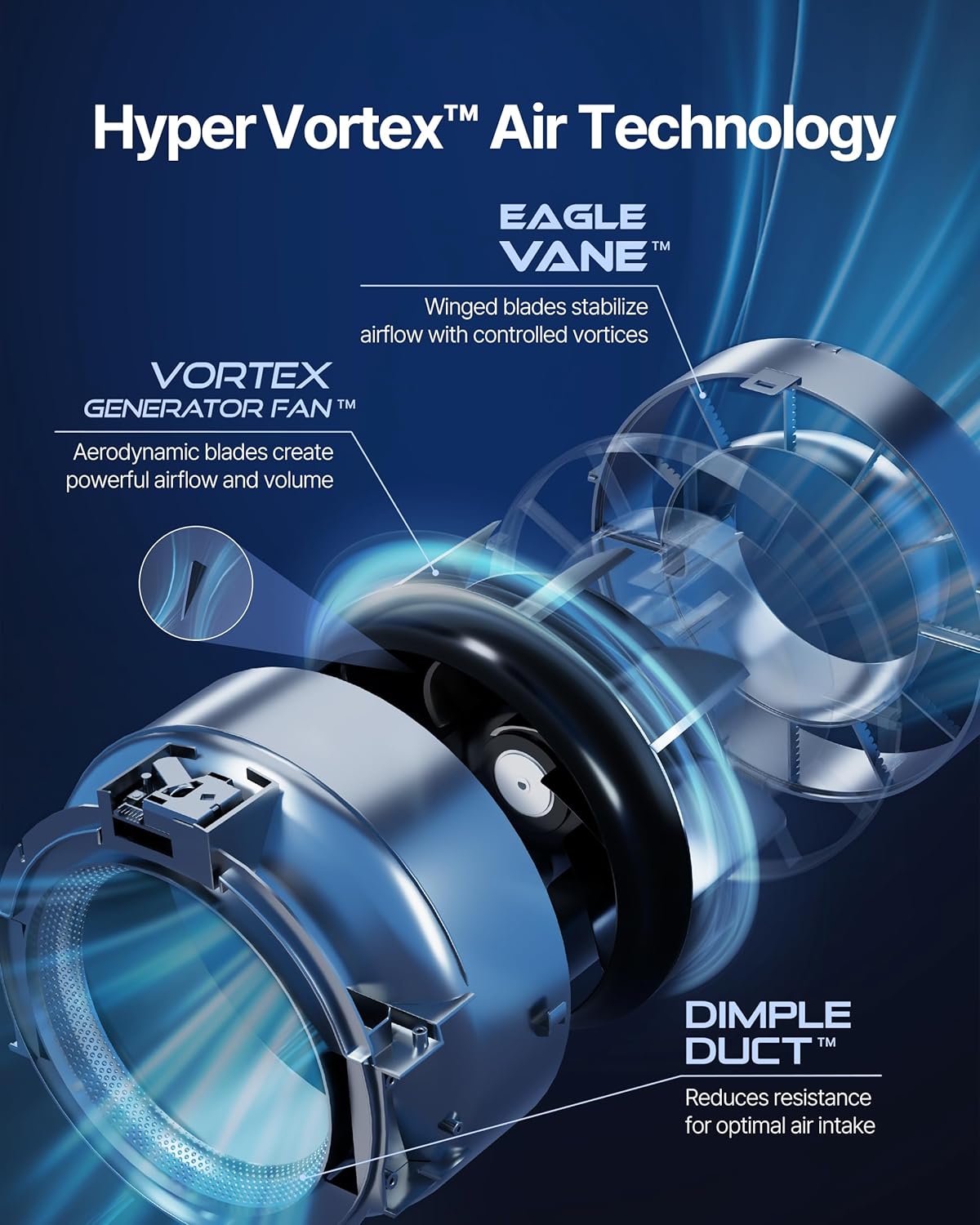 - AERODYNAMIC AIR PURIFICATION HyperVortex air technology optimizes airflow, enhances filtration efficiency, minimizes airloss, all with remarkable speed and whisper-quiet operation at 21.6 db. Up to 3,286 ft² in just 60 mins