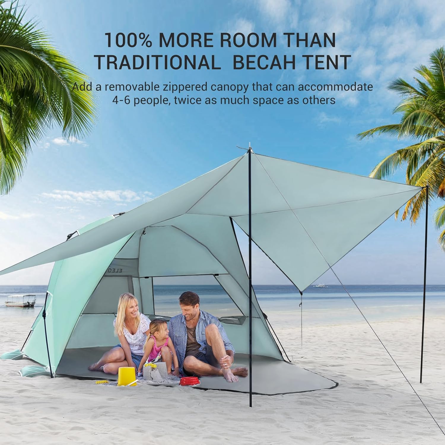 - Super Spacious - Elegear Pop Up Beach Tent sets itself apart from ordinary tents on the market with its innovative detachable canopy design. This feature not only provides excellent sun protection but also doubles the available space, making it perfect for families or groups of friends gathering together. With a capacity of up to 4-6 people, ideal for any outdoor activities where you want to enjoy some shade and refreshment with your loved ones.