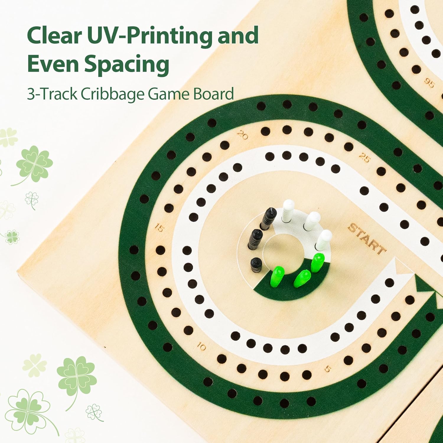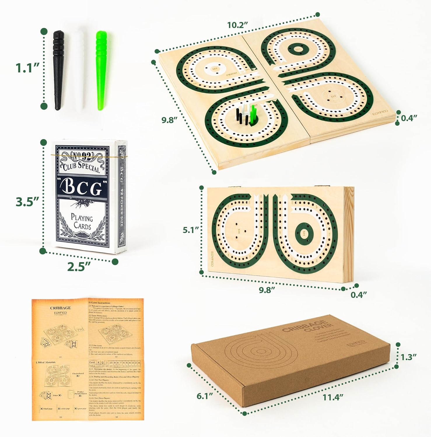 - UNIQUE 3-Track Scoreboard: Our Foldable Cribbage Game Sets features cloverleaf-shaped when the panel is unfolded for play. 3-Track scoring tracks in warm natural wood, fresh green, and crisp white – a design that’s both functional and Eye-Catching Play