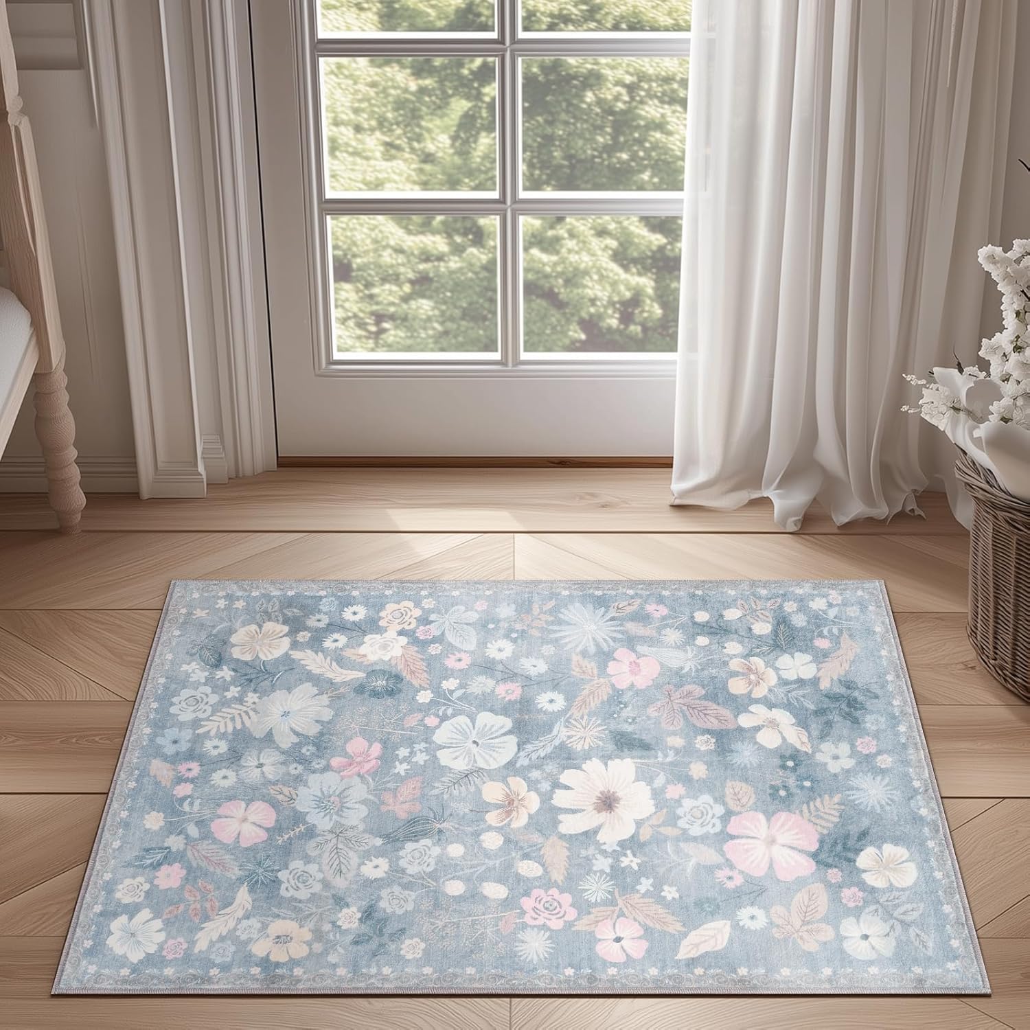 Washable Rugs 2x3 Throw Rugs for Entryway Non Slip Stain Resistant Doormat Light Blue Low Pile Faux Fur Farmhouse Boho Floral Area Rugs for Front Door Kitchen Bed Bedside Pet Home Decor