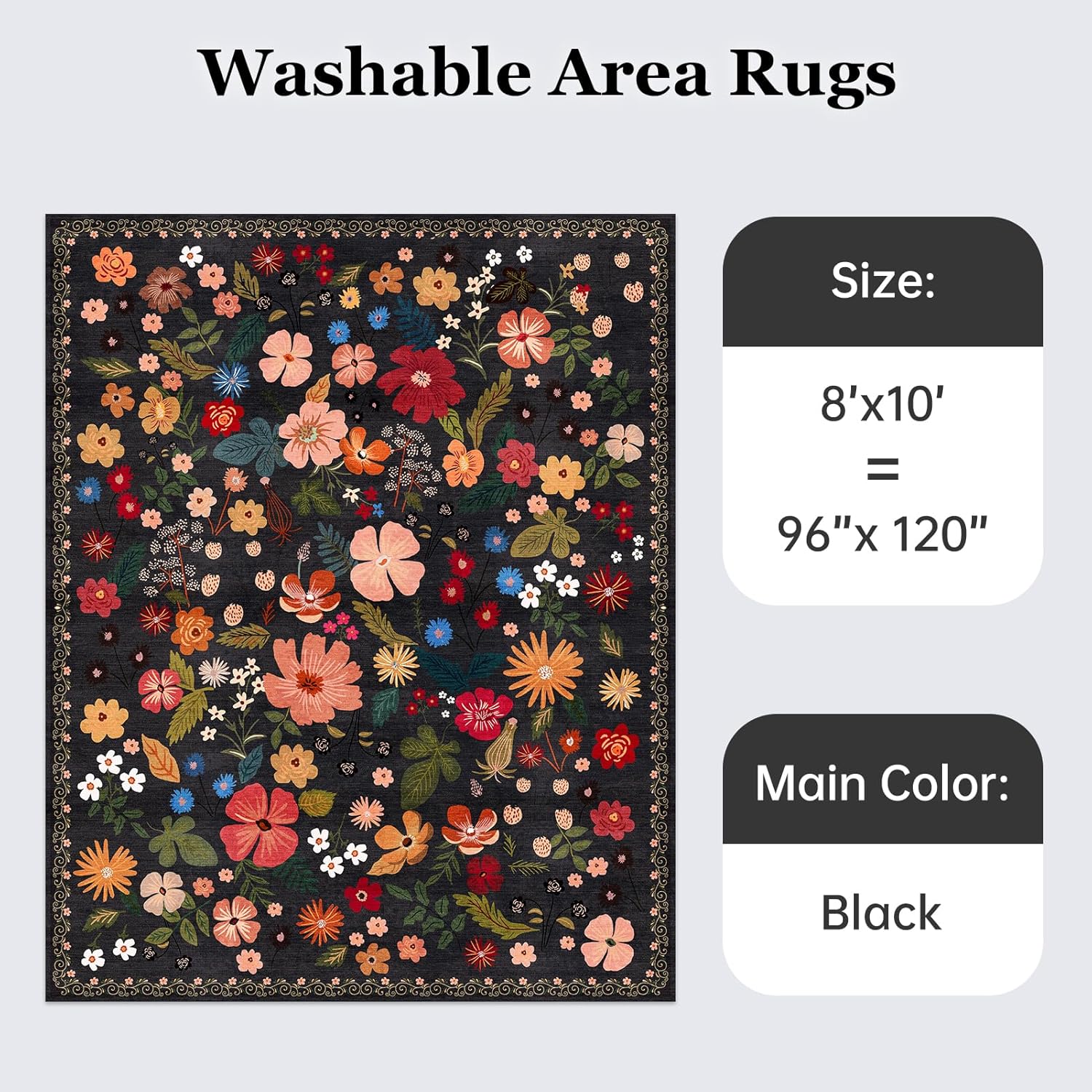 Black 8x10 Area Rugs for Large Living Room Machine Washable Non-Slip Backing Boho Floral Rugs Soft Faux Wool Low Pile Stain Resistant Dark Carpet Rug for Cozy Bedroom Dining Room Nursery Kids Room