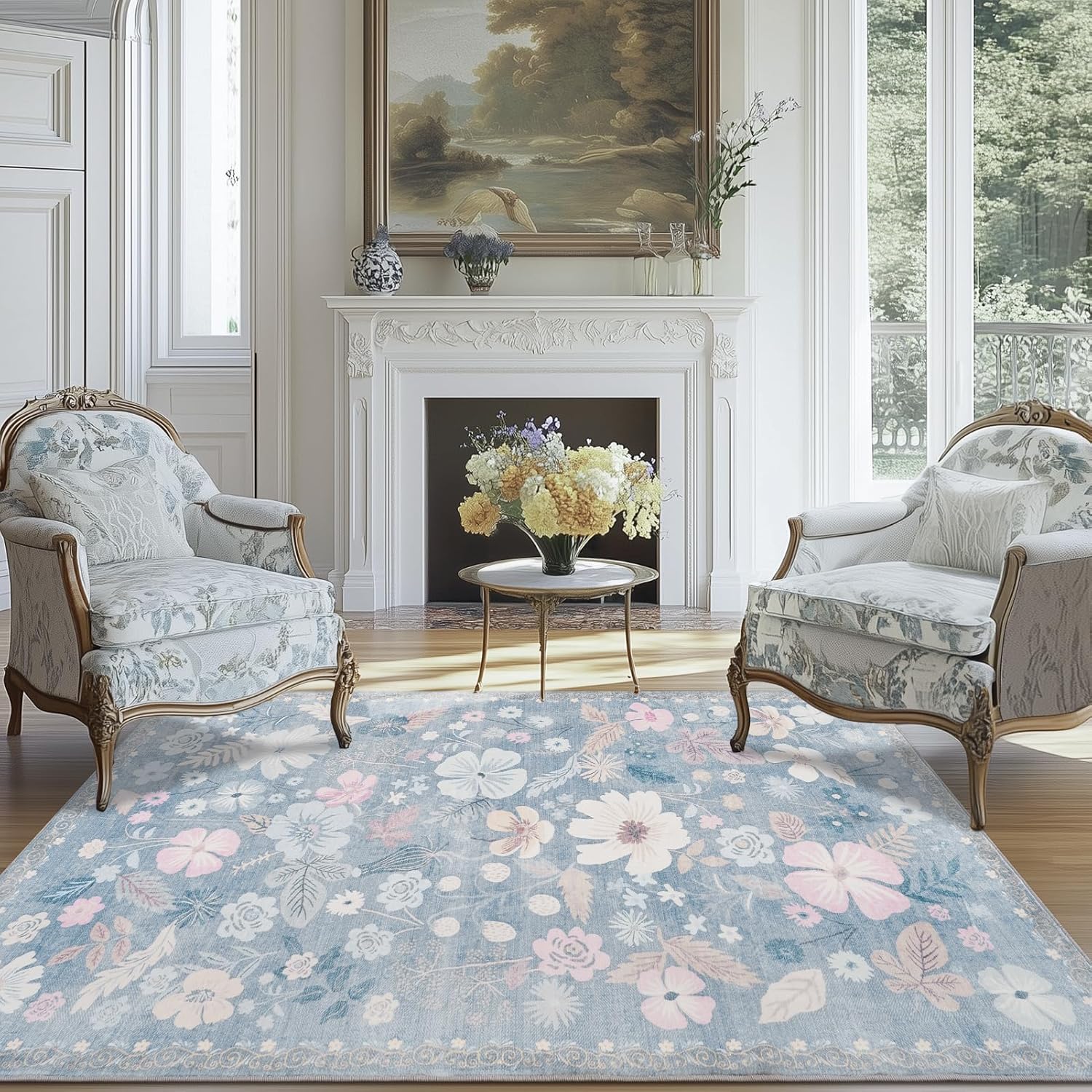 Blue Area Rugs for Living Room 4x6 Washable Low Pile Non Slip Stain Resistant Vintage Euro Floral Soft Faux Fur Carpet Rug for Living Room Bedroom Patio Dining Room Home Office Nursery Kids Room