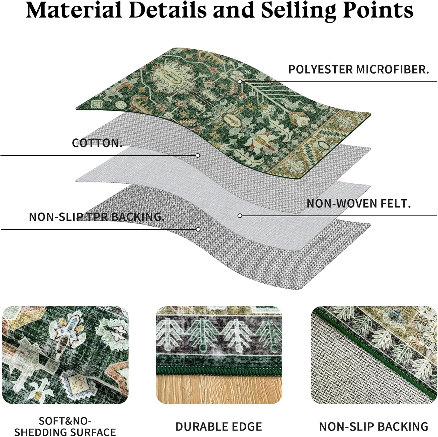 9x12 Area Rug Washable: Oriental Soft Area Rug for Living Room Bedroom No Shedding - Low Pile Thin Carpet Rug for Dining Room Non Slip - Boho Vintage Rug for Home Decor - Retro Forest Green