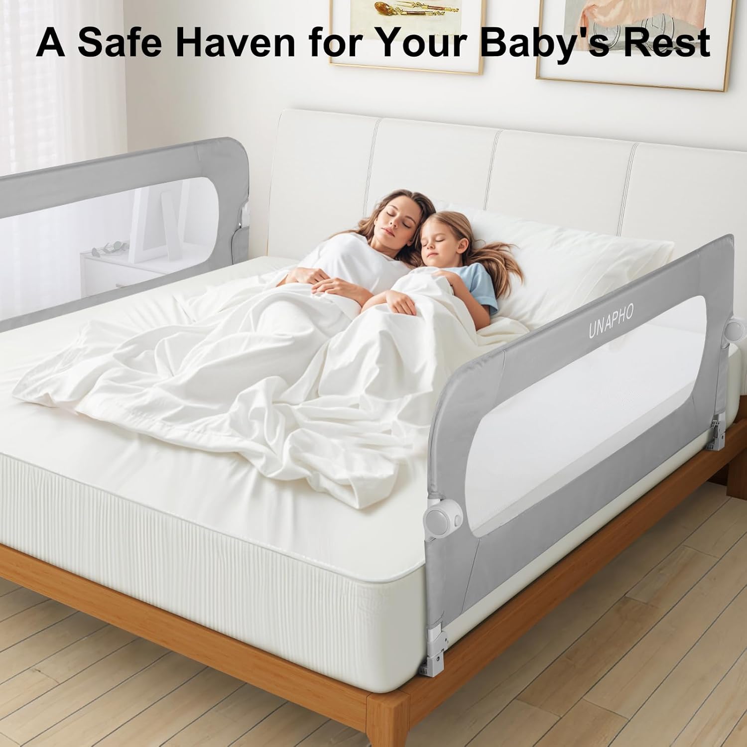 - Sturdy and Durable: The UNAPHO baby bed rails is with durable steel frame structure and a U-shaped base design, providing a larger force area and reducing the risk of sliding. Each bed rail guard is equipped with threaded screws and adjustable anchor strap, which can be adjusted according to the size of the bed to ensure that the bed guardrail can be fixed to the bed