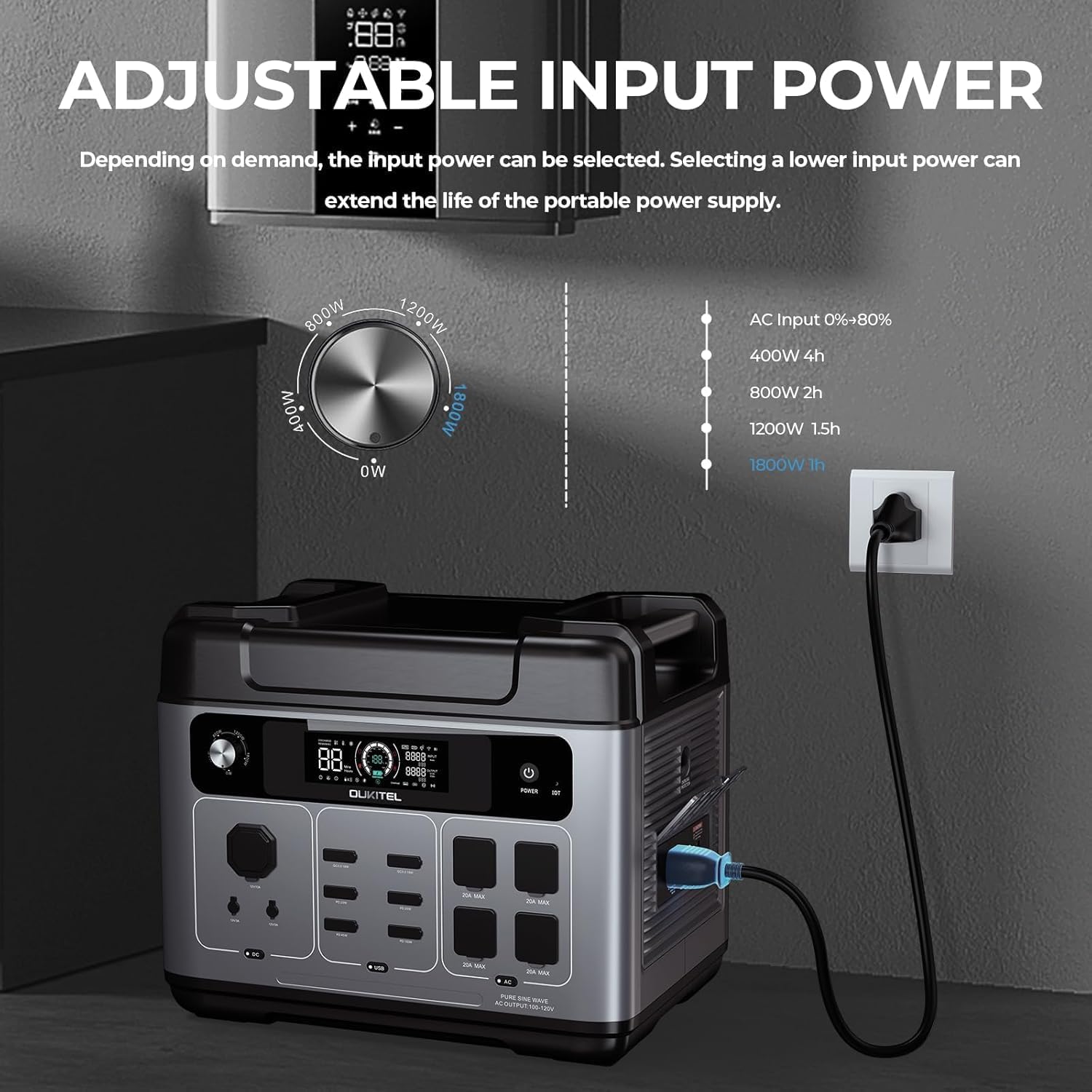 - [Fully charged in 1.5 hours with dual charging]OUKITEL P2001 PLUS technology enables dual charging, so it can be fully charged in about 1.5 hours despite its large capacity. It can be fully charged in about 2 hours at 1800W, which is much faster than other products. It also lets you charge immediately when you need to. It works with AC adapters and solar panels (11.5V to 48V, max. 500W), car cigarette sockets (12V/24V), and generators. Use the solar panel 200W with it.