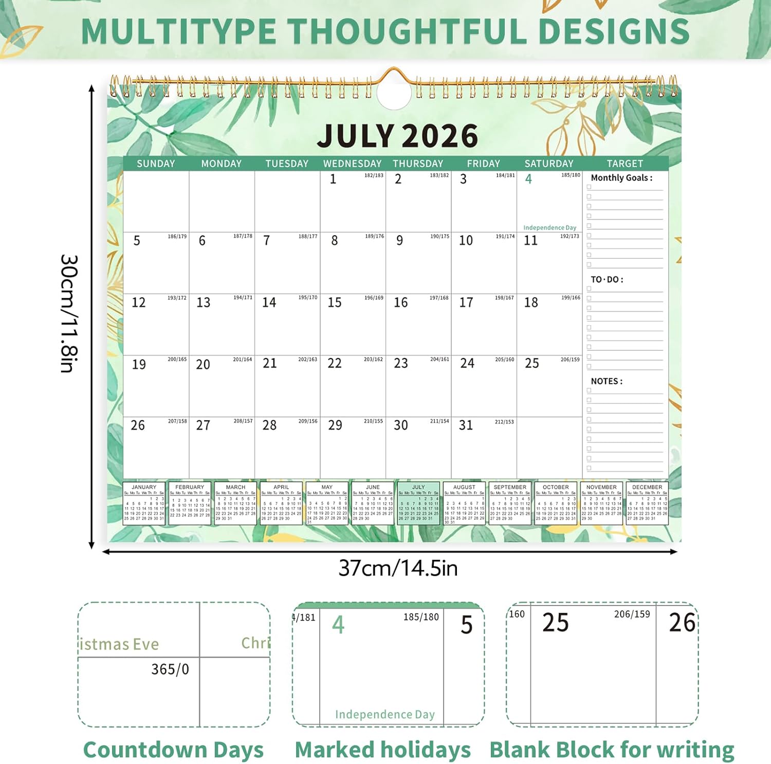 Wall Calendar 2025-2026, 18 Month Large Desk Calendar from July 2025 to December 2026 14.5" x 11.8" Monthly Calendar with Twin-Wire Binding for Home Office Planning Personal Organisers, Green Leaf