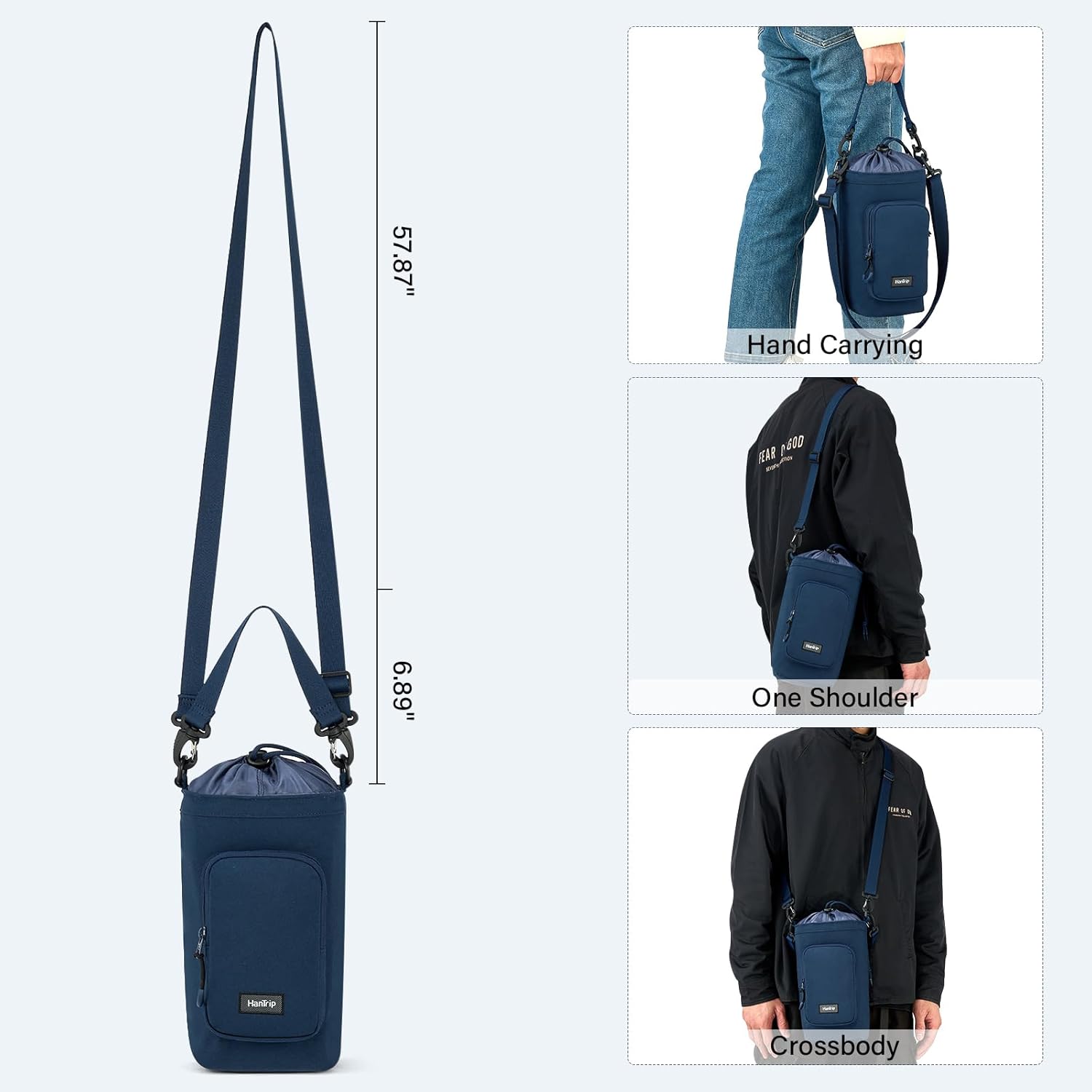 - [Water Bottle Holder with 2 Straps] Water bottle sling bag has 2 detachable and adjustable straps. One can be used as a top handle to hang on other objects such as luggage handle or backpack strap for hands-free convenience, while the other can be adjusted in length (28" to 58") for various carrying methods such as handbag, shoulder bag, sling bag, crossbody bag and so on.