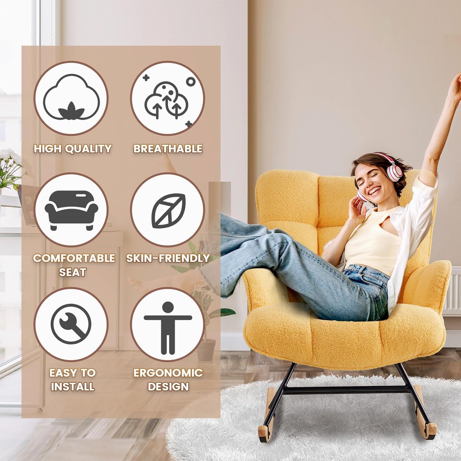 Rocking Chair Nursery Teddy Upholstered Glider Rocker Rocking Accent Chair Padded Seat with High Backrest Armchair Comfy Side Chair for Living Room Bedroom Offices (Yellow Teddy)