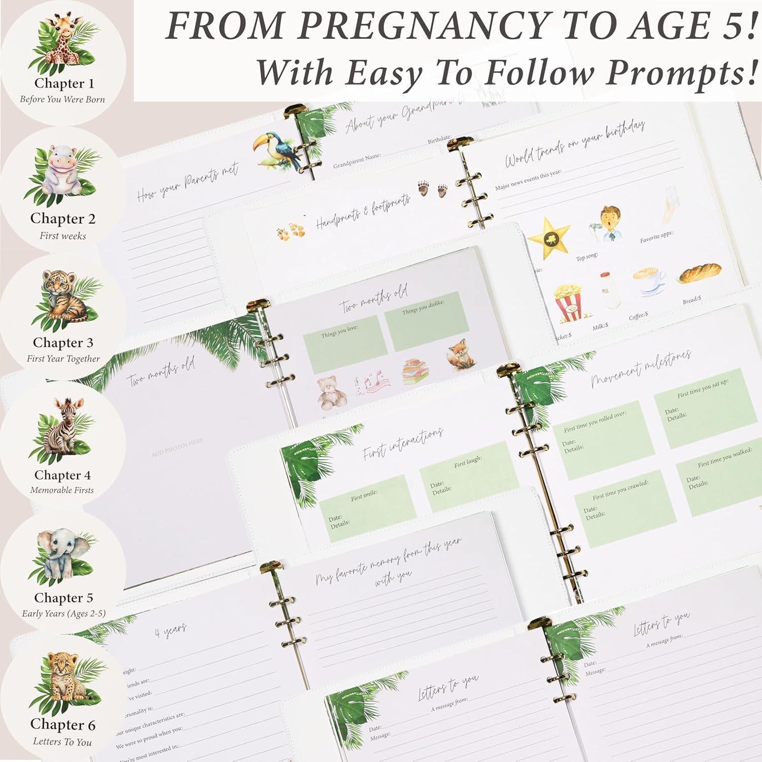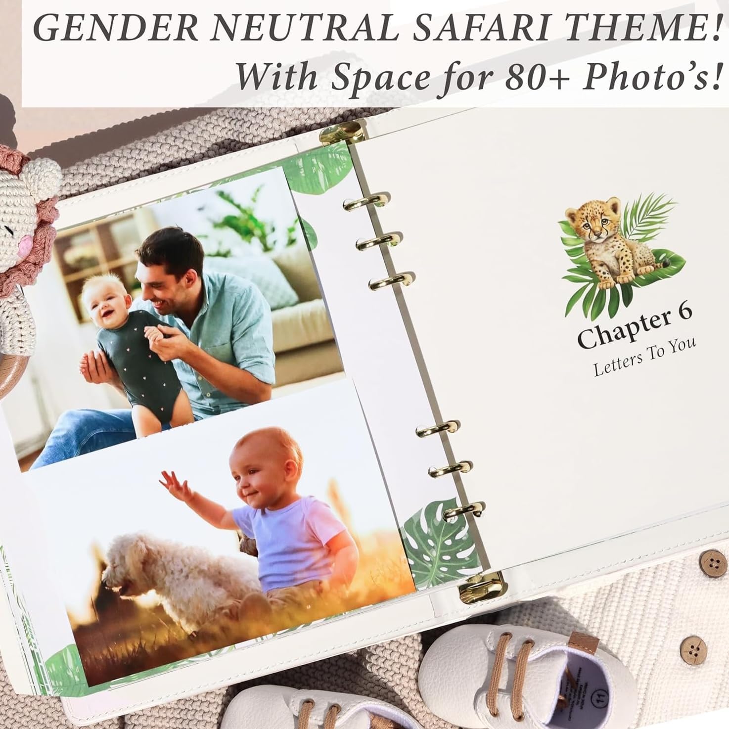 - PERSONALIZED BABY BOOK β This adorable SAFARI ANIMAL baby book lets you capture every milestone. Customize the faux-leather cover with your babyβs name for a personal touch, then add photos and fill out fun prompts to create a cherished keepsake.