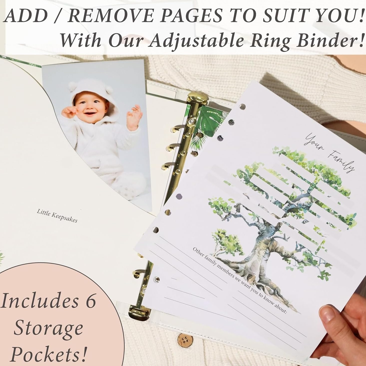 - DURABLE, MODERN DESIGN β With gold foil stamping, thick paper, and 6 storage pockets, this keepsake book is as durable as it is beautiful. The faux-leather cover protects your memories, while the flexible binder allows you to store special items like hospital wristbands.