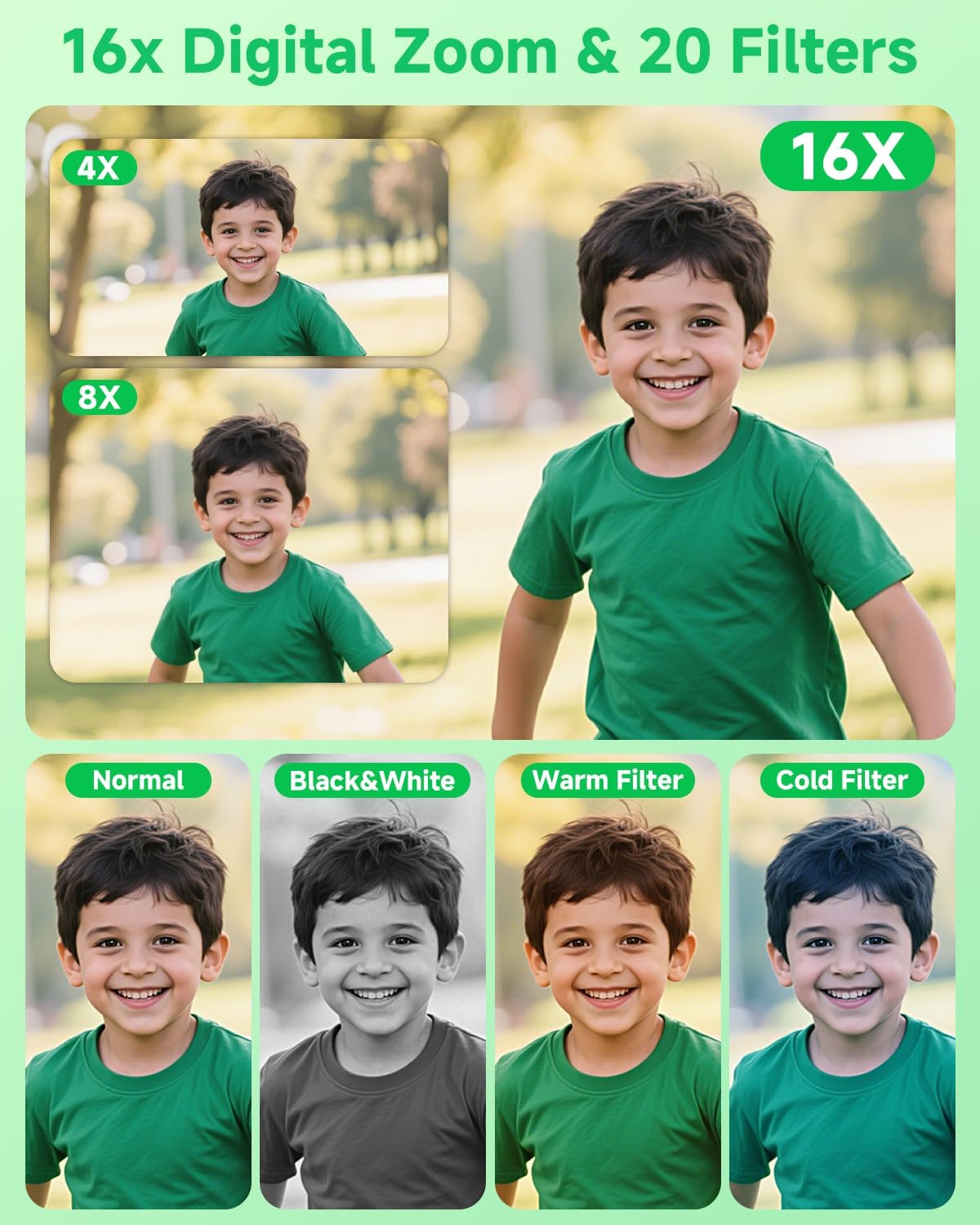 - 【16X Digital Zoom & Multi-function】: This kids digital camera not only supports 16x digital zoom(with a W/T button, but also support anti-shake, continuous shooting, face and smile detection, self-timer, and more.