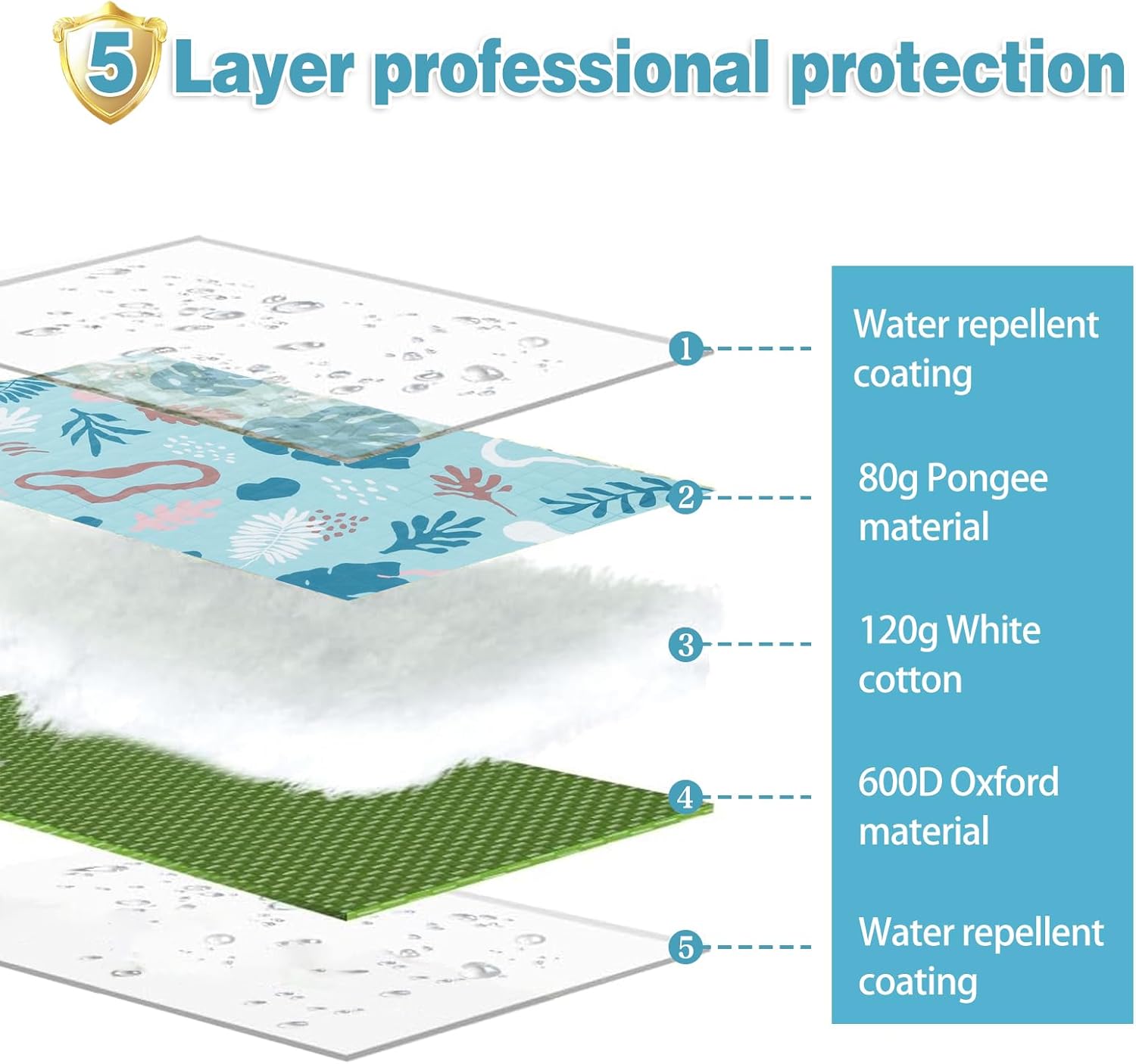 - 5-Layer waterproof shield: Water-repellent coating (top/bottom) + 80g pongee + premium 120g cotton + heavy-duty 600D Oxford fabric blocks moisture, sand, and grass stains