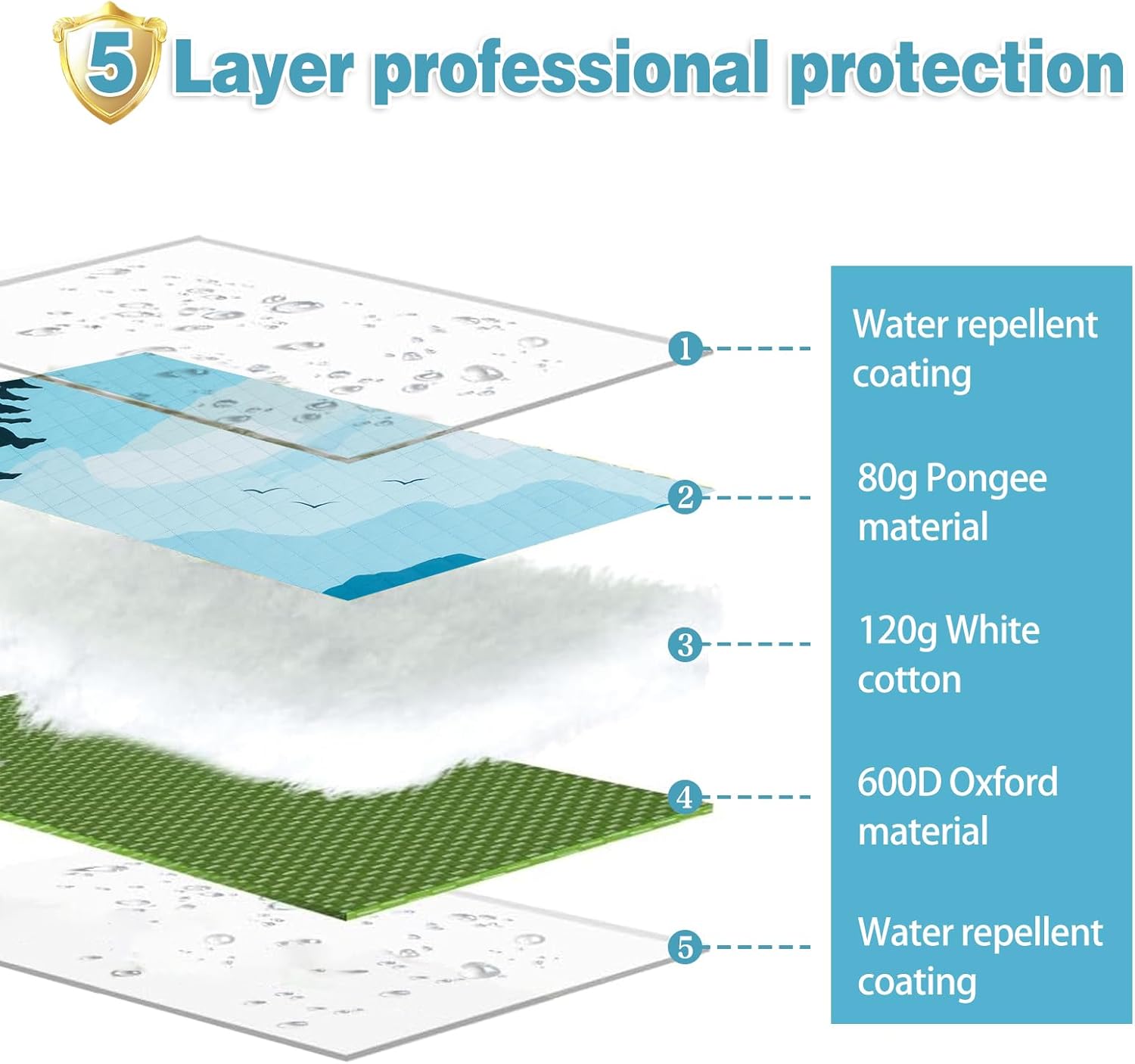 - 5-Layer waterproof shield: Water-repellent coating (top/bottom) + 80g pongee + premium 120g cotton + heavy-duty 600D Oxford fabric blocks moisture, sand, and grass stains