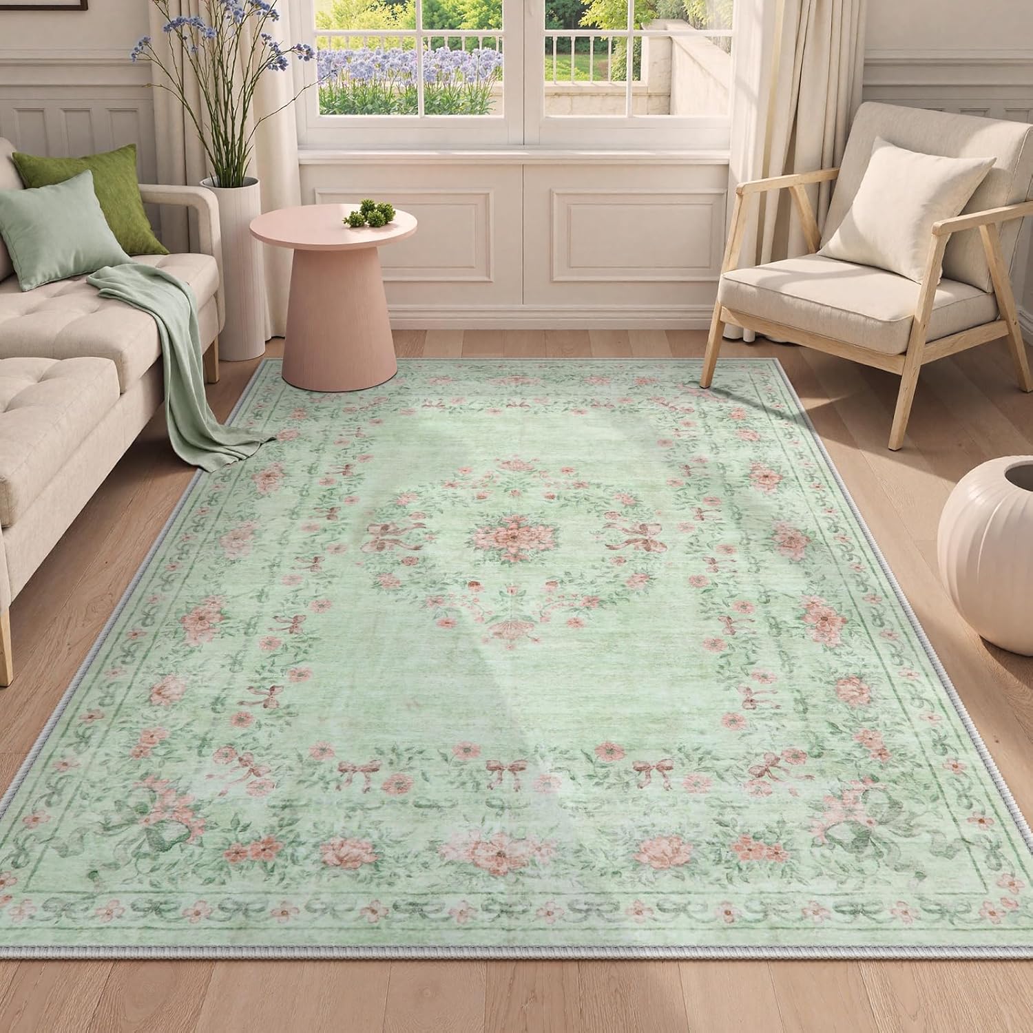 Wonnitar Floral Bow Print Washable Rugs 5x7, Sage Green Rug for Living Room, Ultra-Thin Non Slip Soft Boho Carpet for Dining Room Bedroom Kid Room Playroom, Light Green